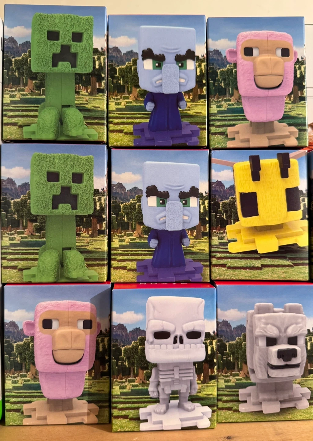 Set of collectible figures from the popular game Minecraft. Includes a Creeper, an Evoker, a Llama, a Bee, a Skeleton, and a Wolf. Figures come in their original boxes.