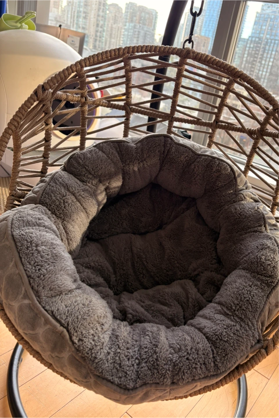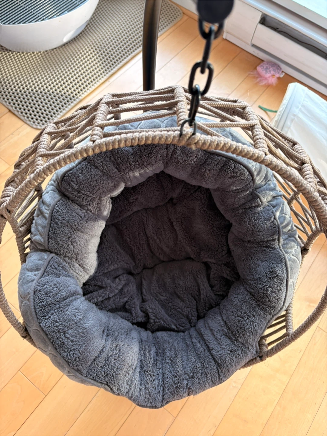 This hanging swing chair comes with a super soft grey plush cushion for ultimate comfort for your cat. It's constructed with a durable woven rattan-style basket and a sturdy metal stand. Great for relaxing indoors or out!