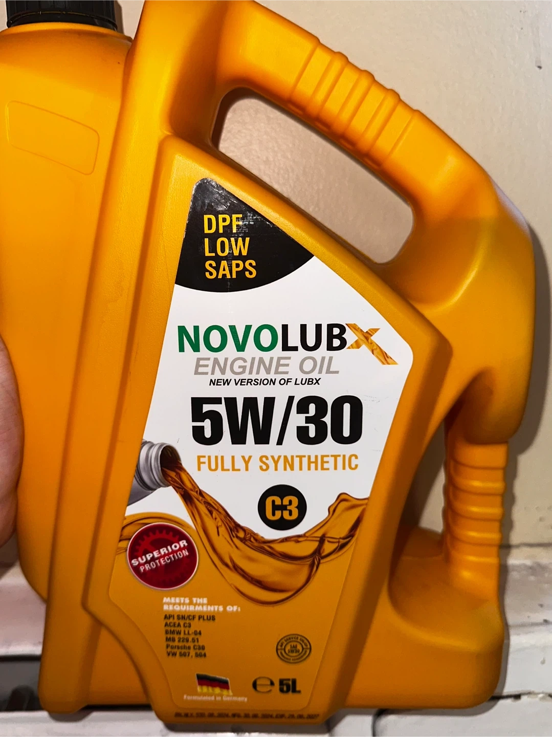 Selling a ≈4.8L jug of Novolub 5W/30 fully synthetic engine oil. It's the new version of Lubx and formulated in Germany. Meets the requirements of API SN/CF PLUS and BMW LL-04. It's suitable for diesel particulate filters (DPF) and is low SAPS.