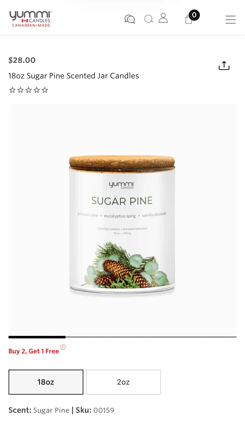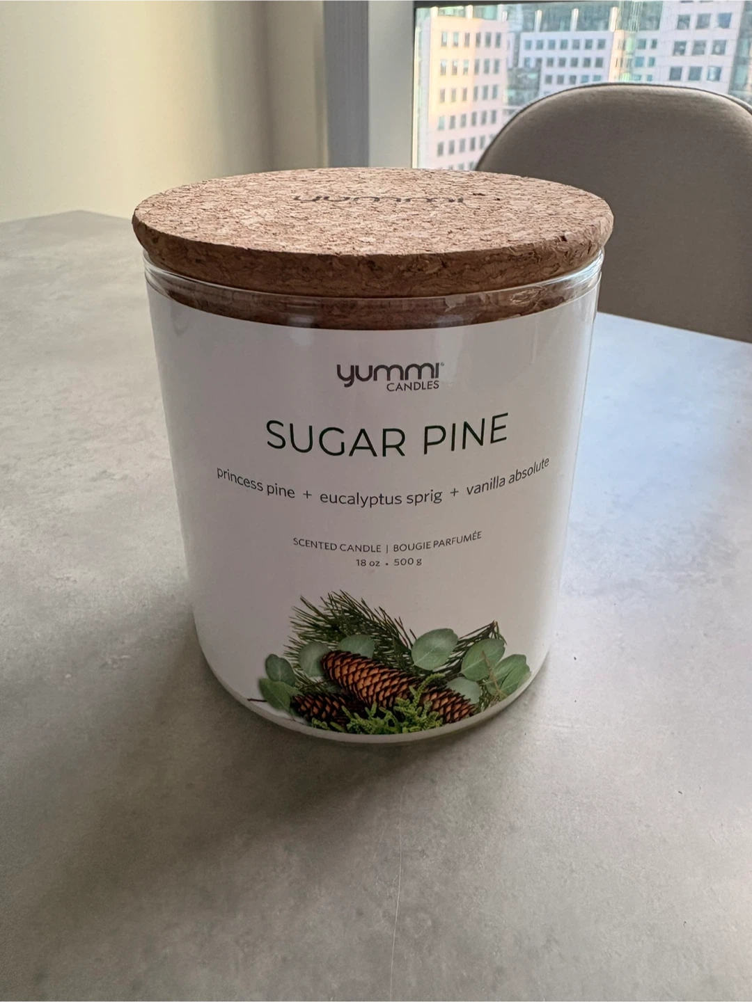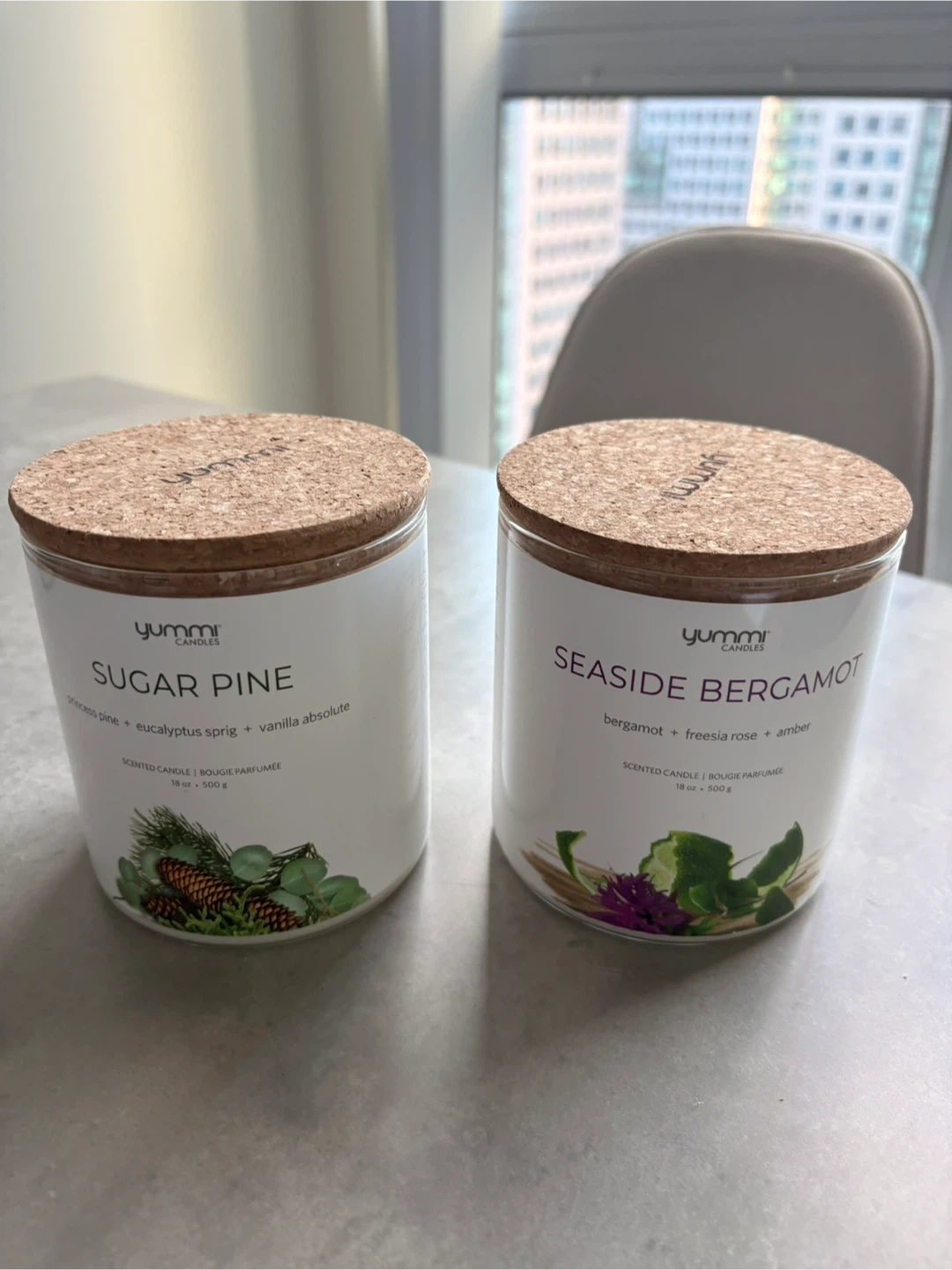 Two large Yummi scented candles (18 oz / 500 g) with cork lids, made in Canada. Scents are Sugar Pine and Seaside Bergamot, both clean and fresh fragrances. Plant-based wax with cotton braided wick and up to 70 hours burn time. Open to selling individually.