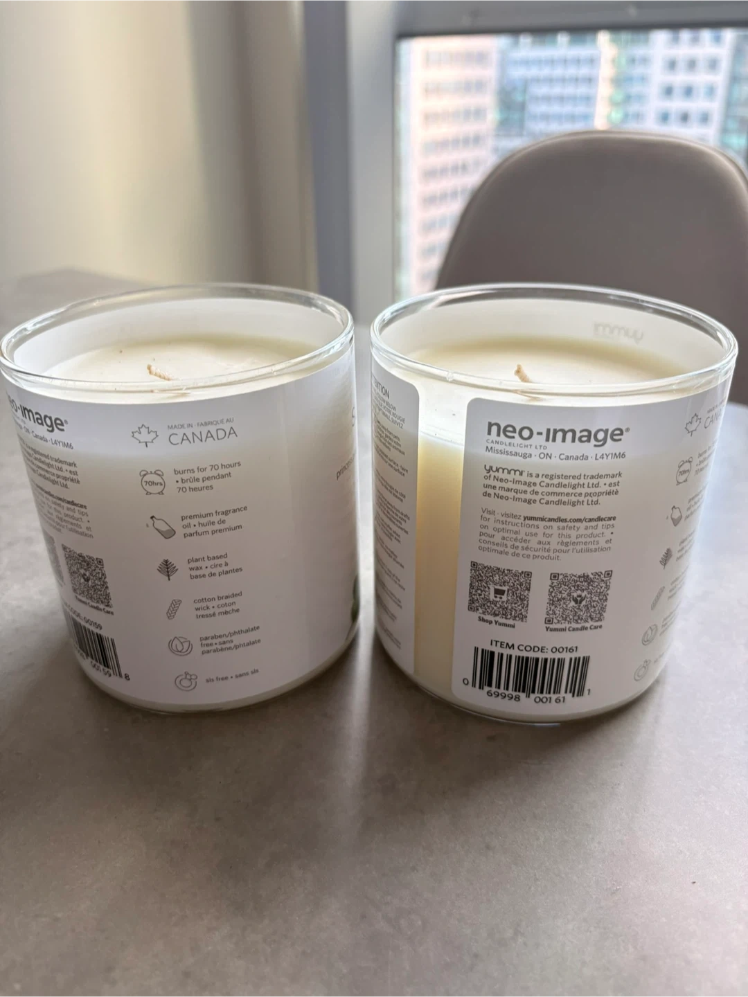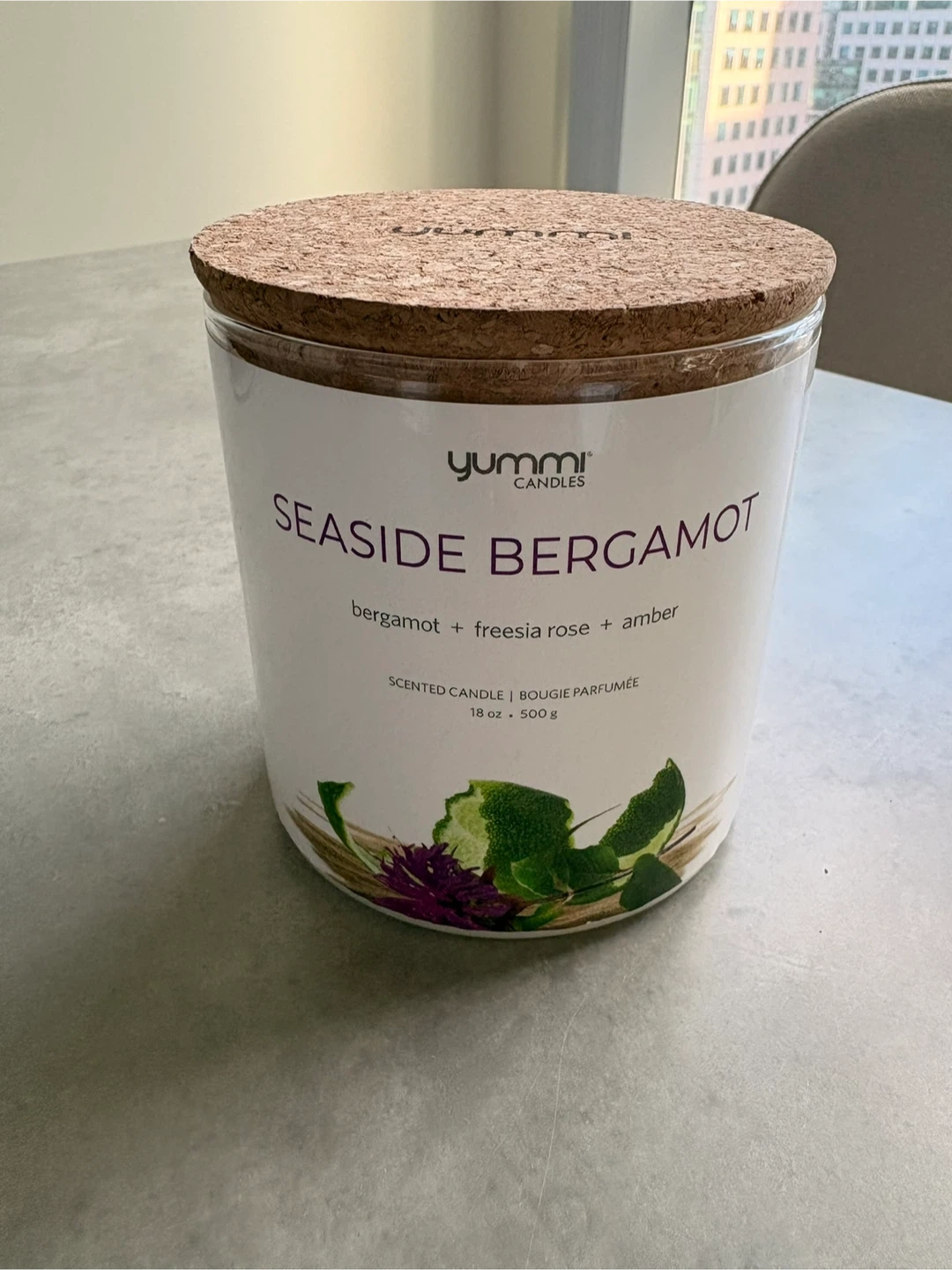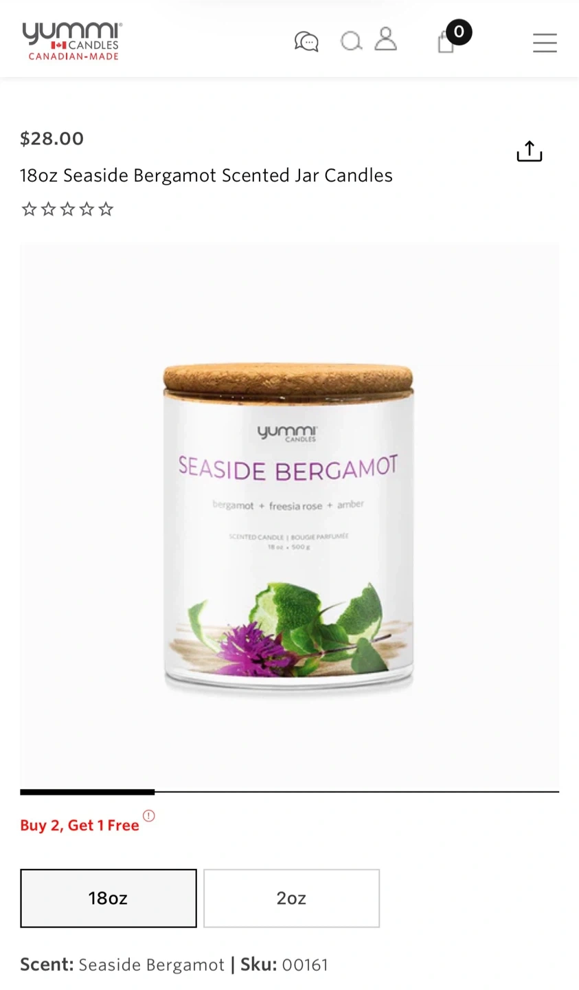 Two large Yummi scented candles (18 oz / 500 g) with cork lids, made in Canada. Scents are Sugar Pine and Seaside Bergamot, both clean and fresh fragrances. Plant-based wax with cotton braided wick and up to 70 hours burn time. Open to selling individually.