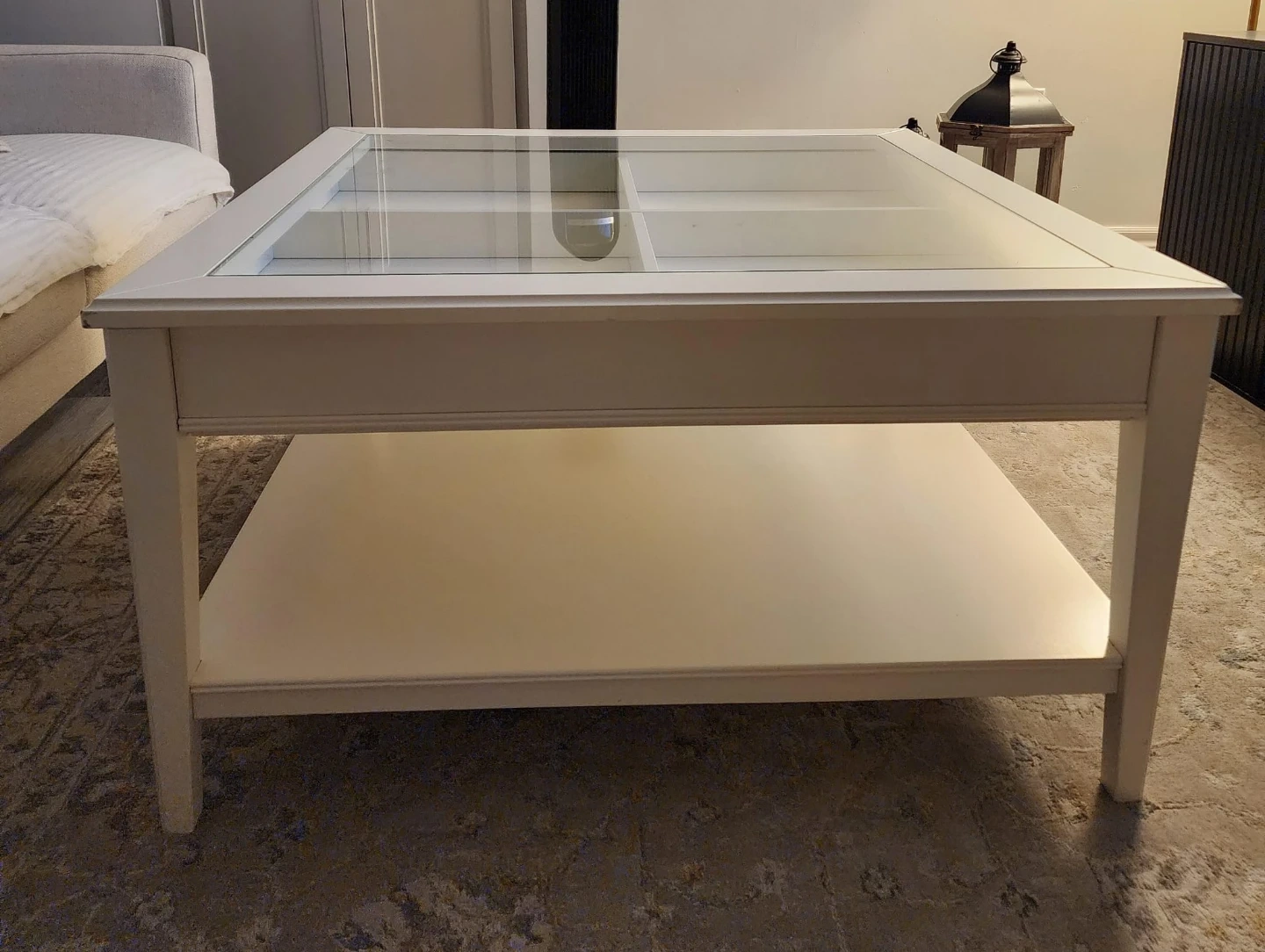 White coffee table featuring a glass-covered top with four compartments for display or storage. It has a drawer and a lower shelf for additional space. This table is perfect for keeping your living room tidy and showcasing decorative items! Looks classy!