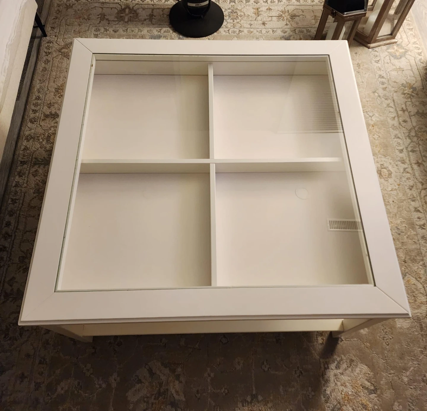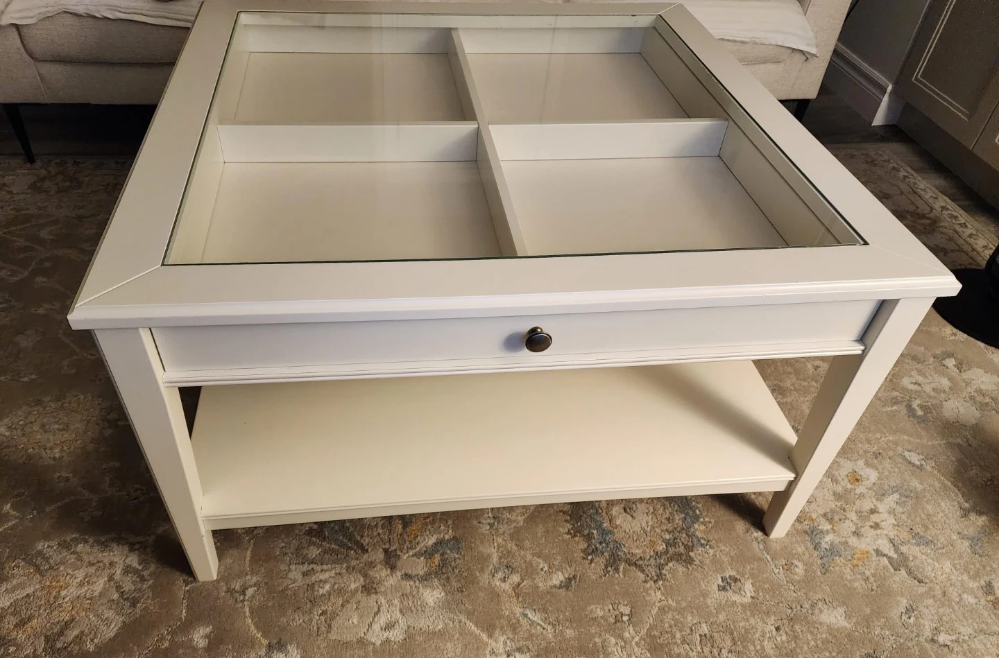 White coffee table featuring a glass-covered top with four compartments for display or storage. It has a drawer and a lower shelf for additional space. This table is perfect for keeping your living room tidy and showcasing decorative items! Looks classy!