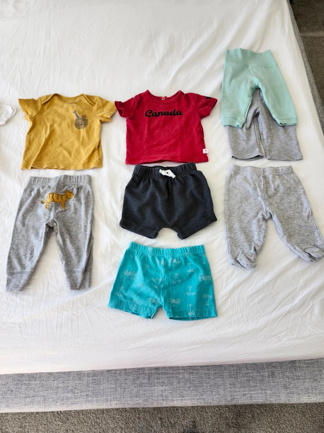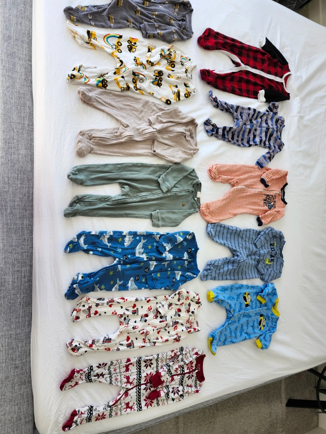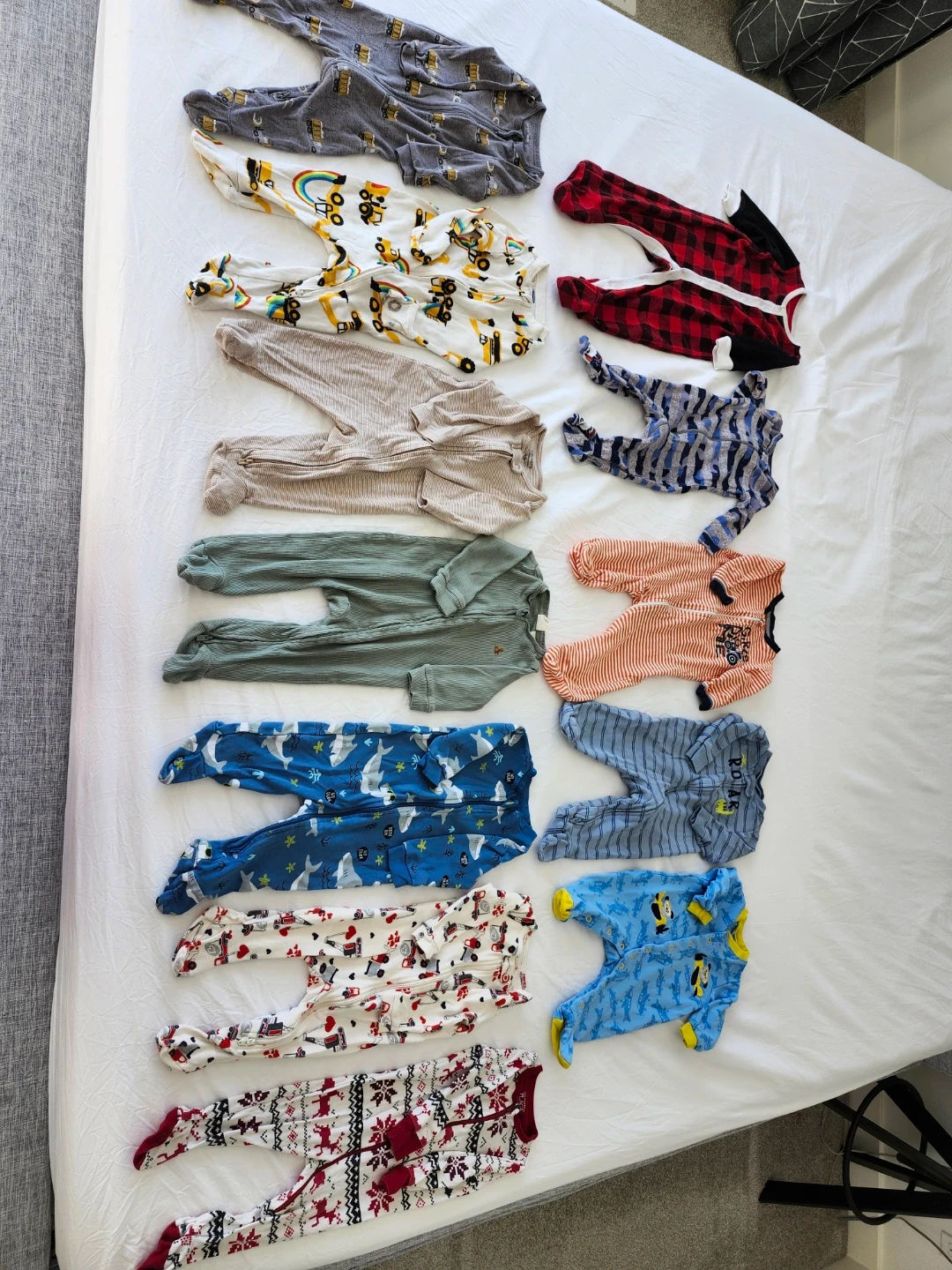 This is a bundle of baby onesies and sleepers in various sizes and designs. They're made from soft cotton materials for comfort. This bundle is perfect for a growing baby's wardrobe.