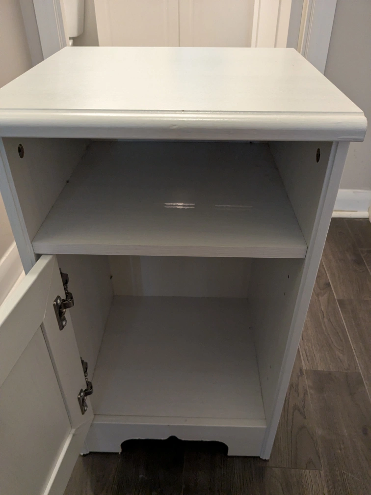 Small, painted white nightstand. One shelf inside and a small cabinet door. Simple design, good for bedroom or small space. Minor wear. Pick-up please.