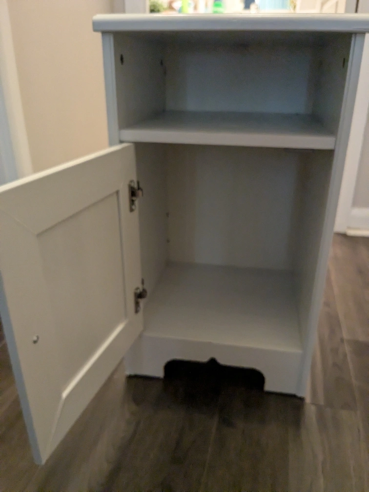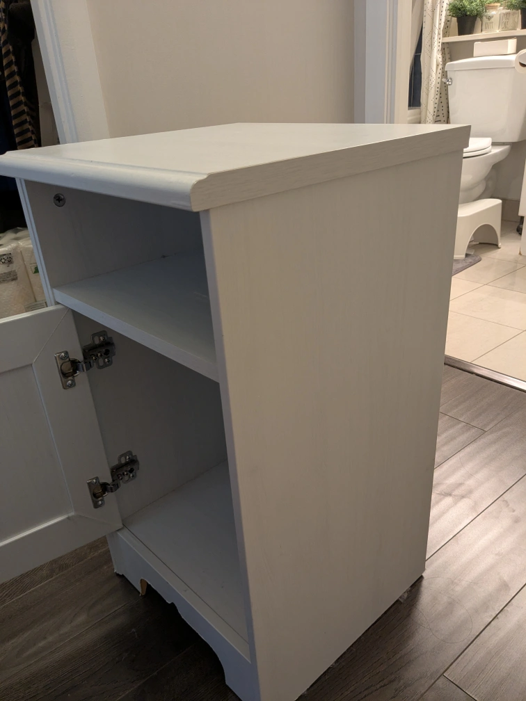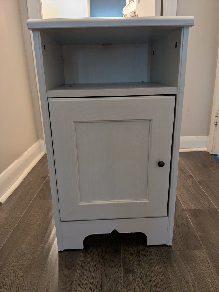 Small, painted white nightstand. One shelf inside and a small cabinet door. Simple design, good for bedroom or small space. Minor wear. Pick-up please.