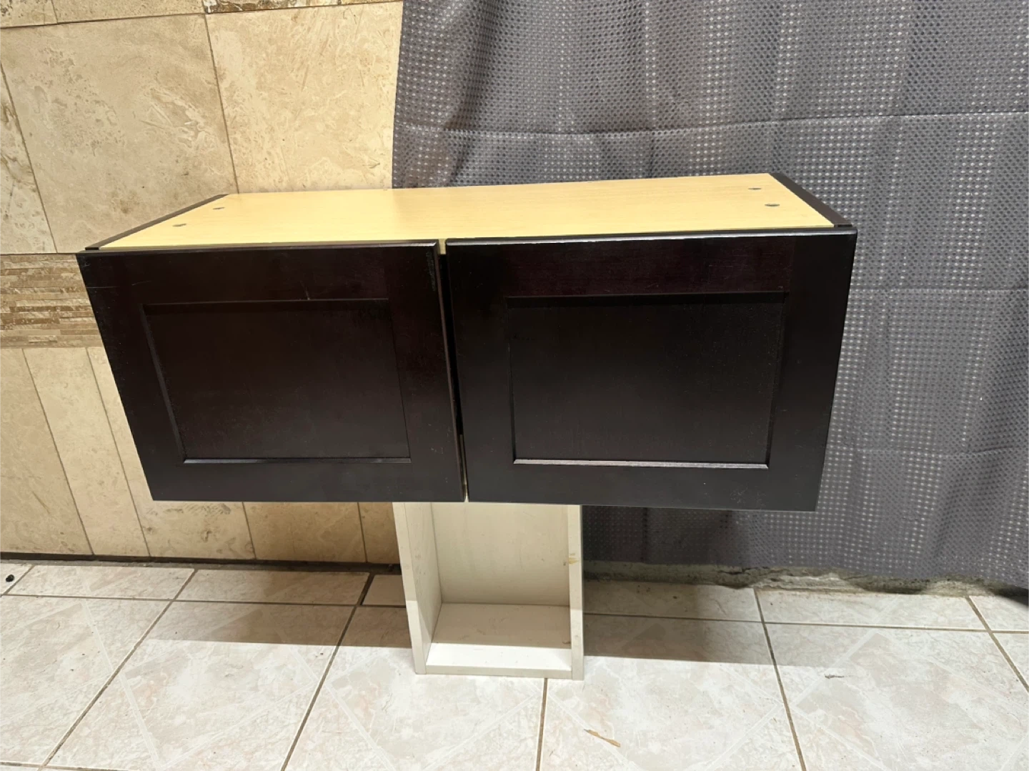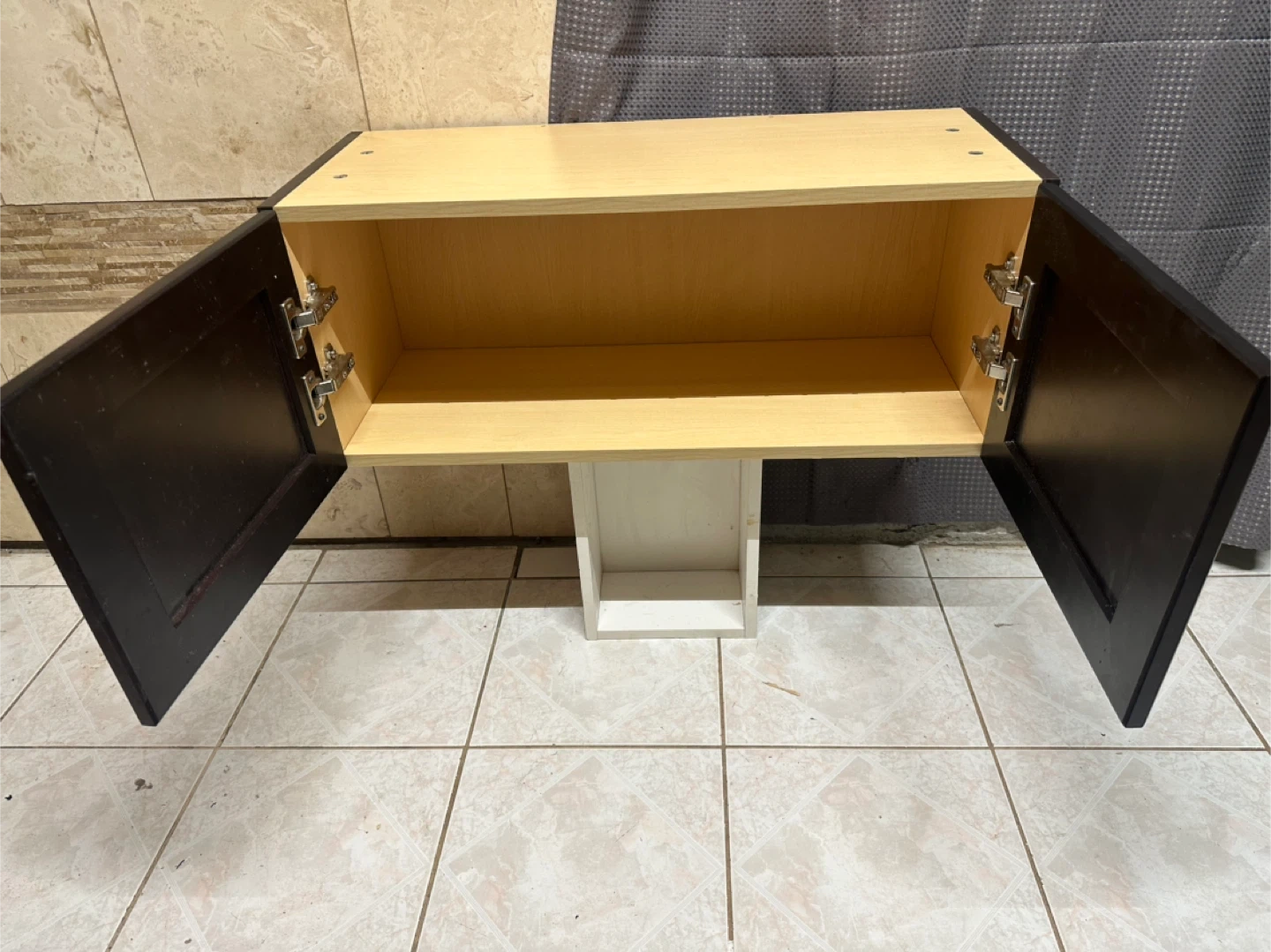 Features two dark wood doors with a clean, modern design and a light wood interior. Doors open smoothly on quality hinges. Perfect for bathrooms, laundry rooms, kitchens, or workshops.