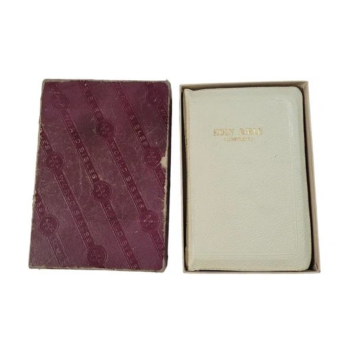 This is a vintage Holy Bible, King James Version, from the 1950s. It's a Junior Gift World Bible in white, and it comes in its original box. Feel free to message if you have any questions!