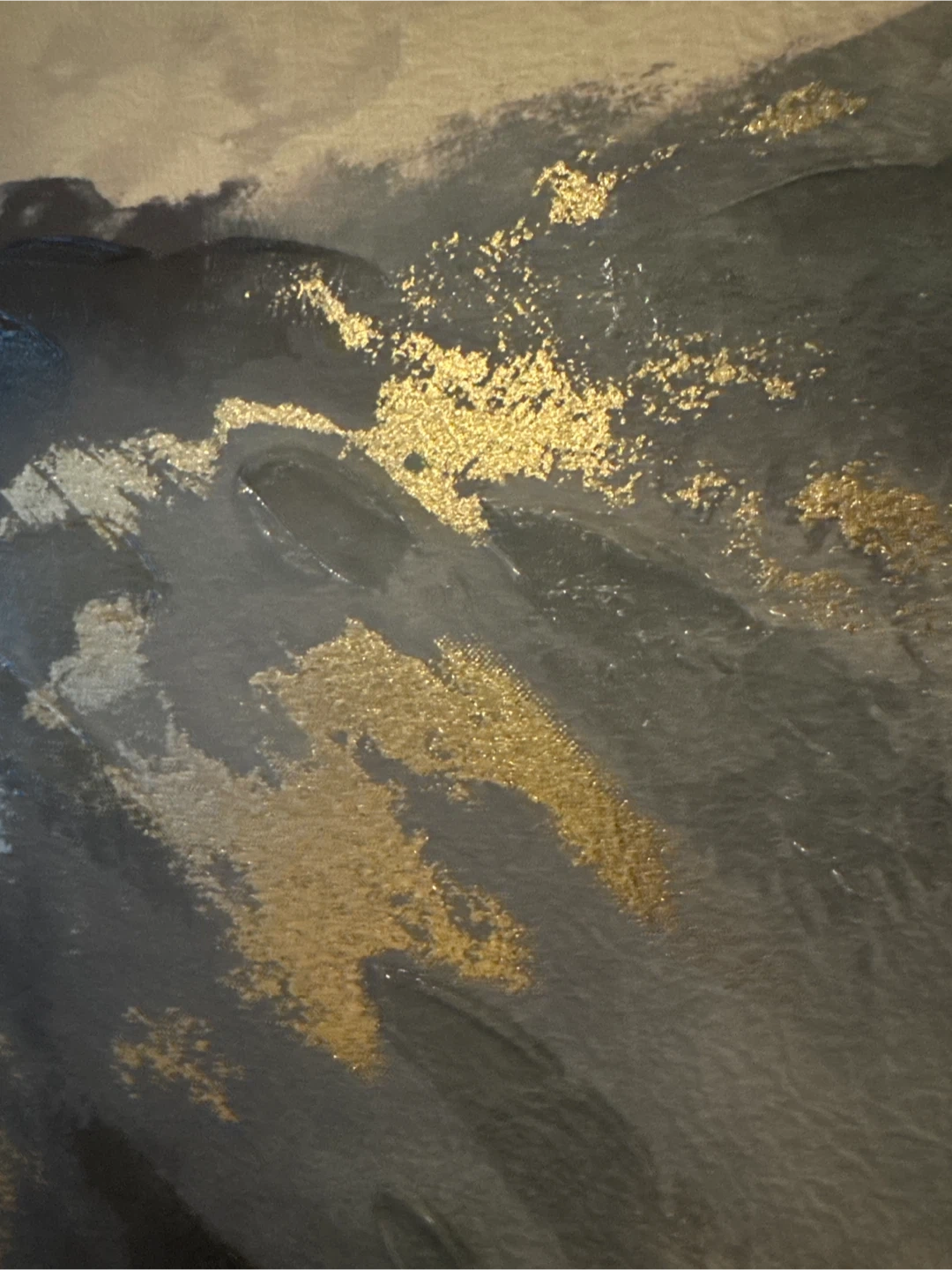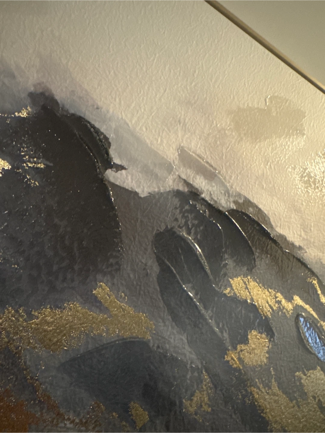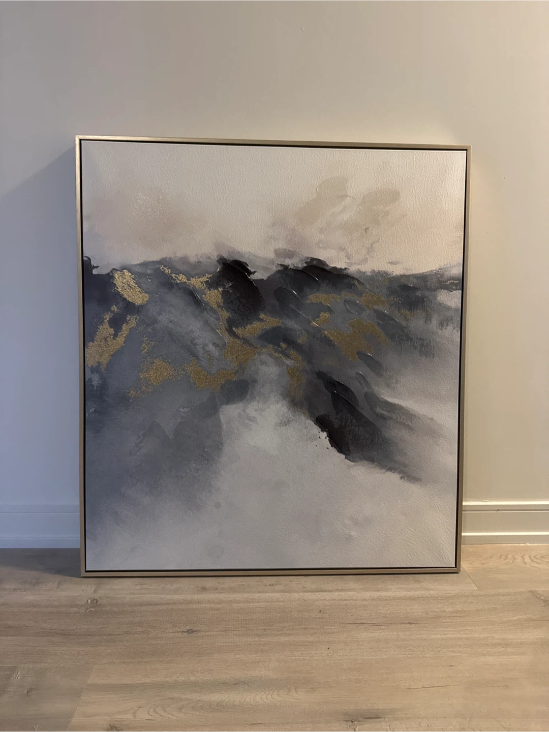 Beautiful framed canvas art featuring abstract mountain scenery with gold accents. The neutral colour palette of grey, black, and white makes it a versatile piece for any room. Canvas material with a brushed metal frame.