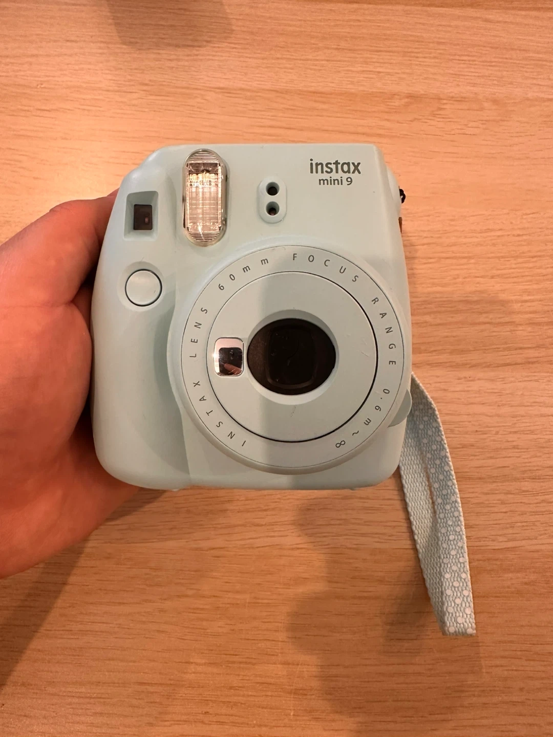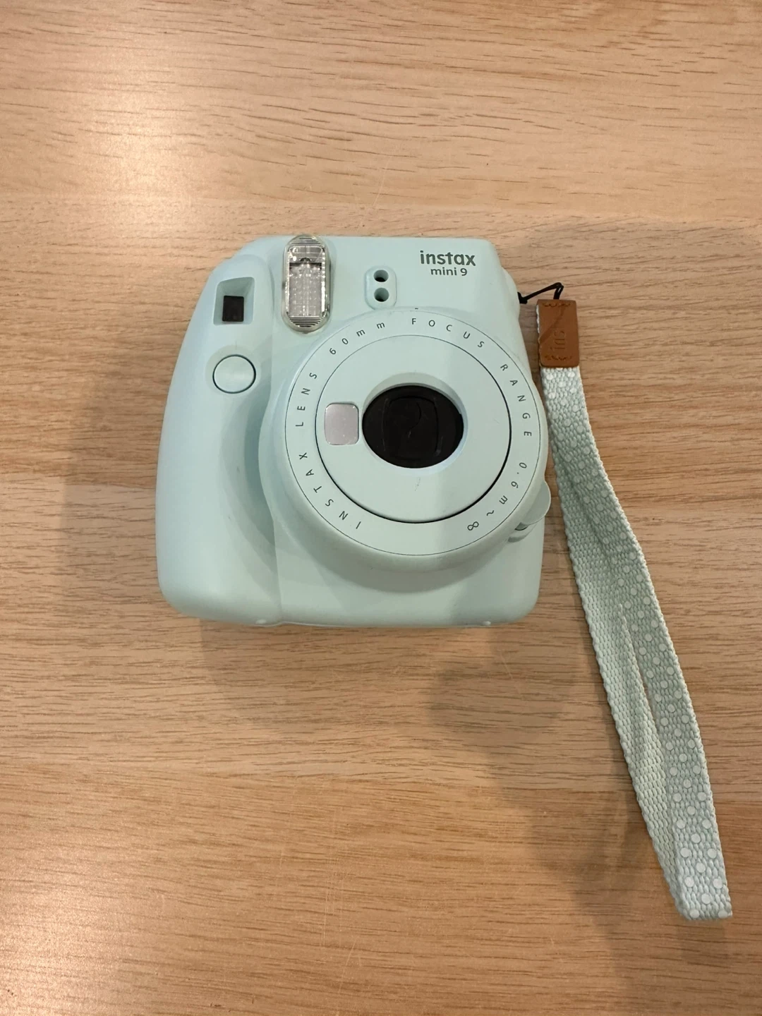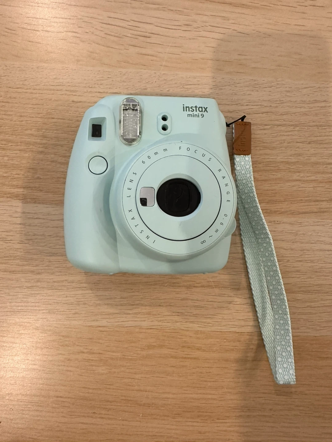 Fujifilm Instax Mini 9 instant camera in a light blue colour. Features a close-up lens attachment and a selfie mirror. Uses Instax Mini film.