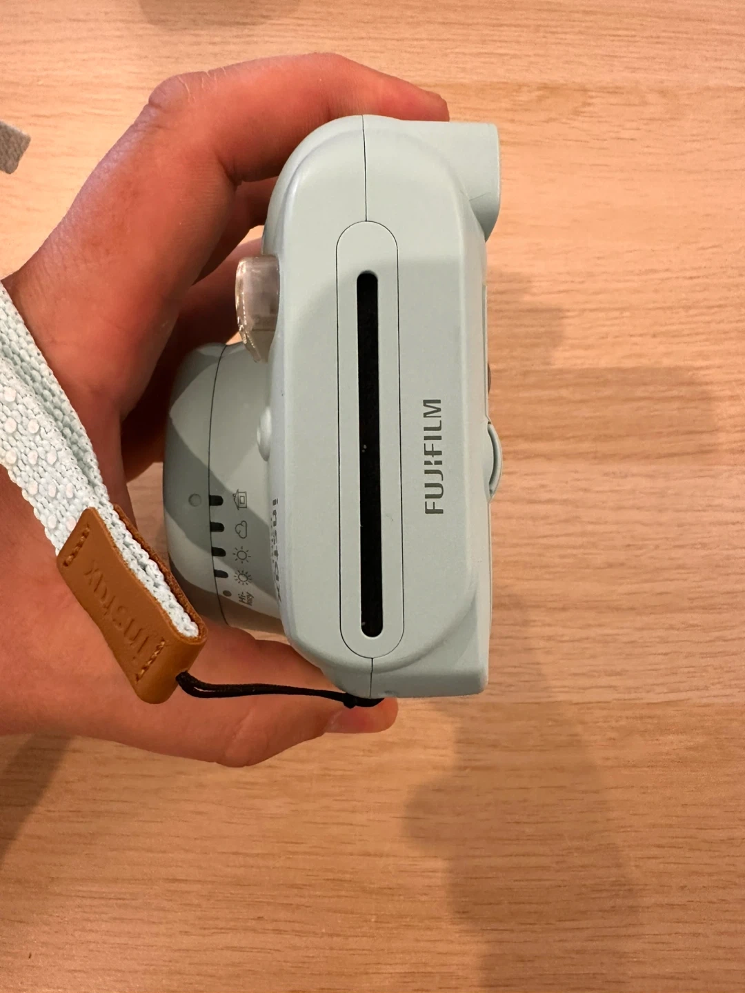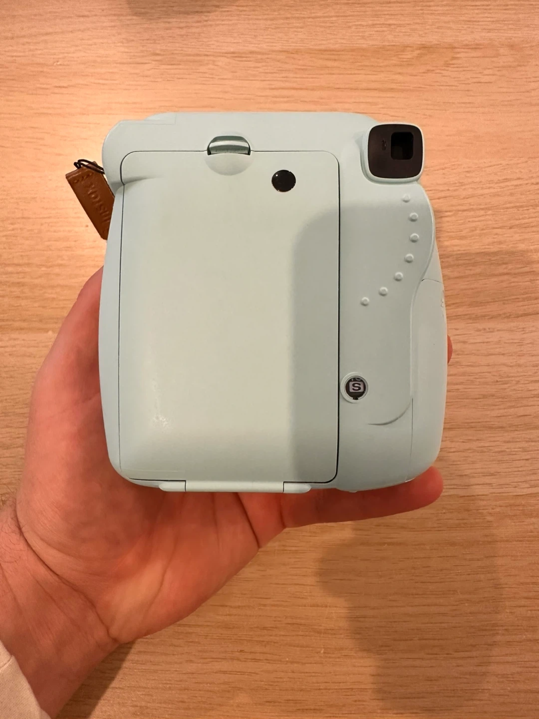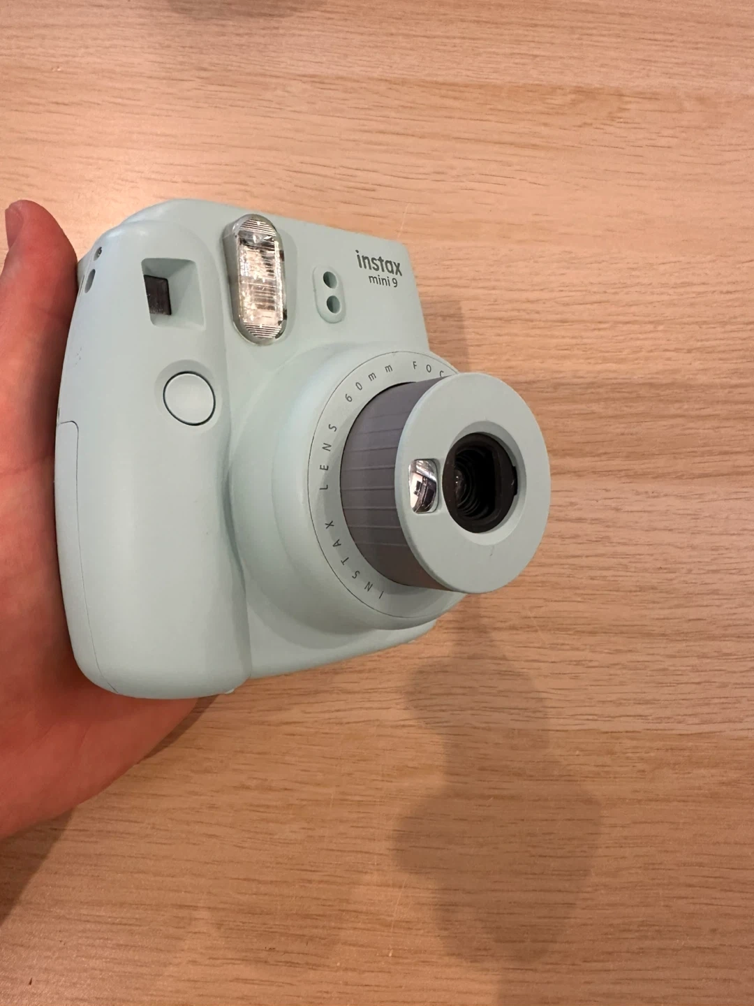 Fujifilm Instax Mini 9 instant camera in a light blue colour. Features a close-up lens attachment and a selfie mirror. Uses Instax Mini film.