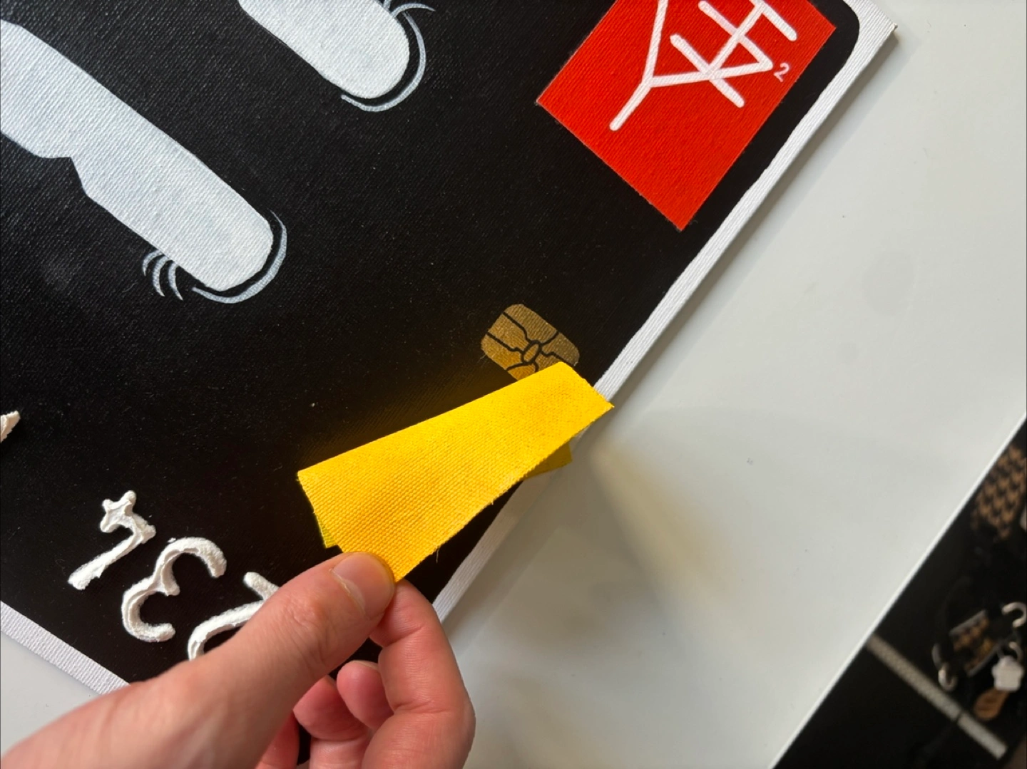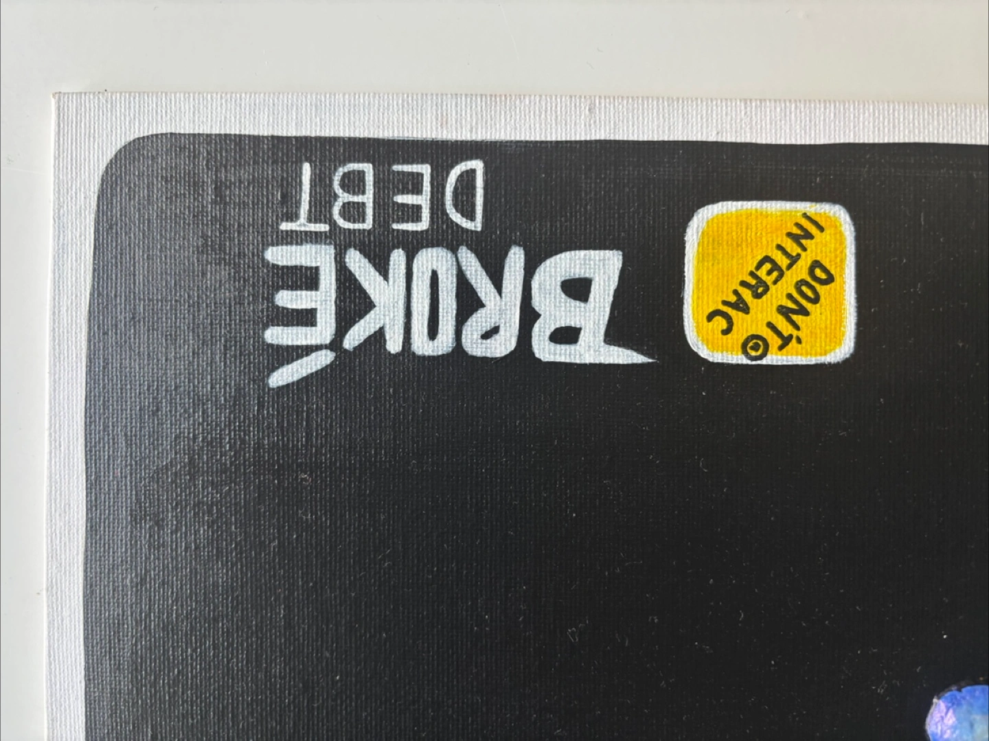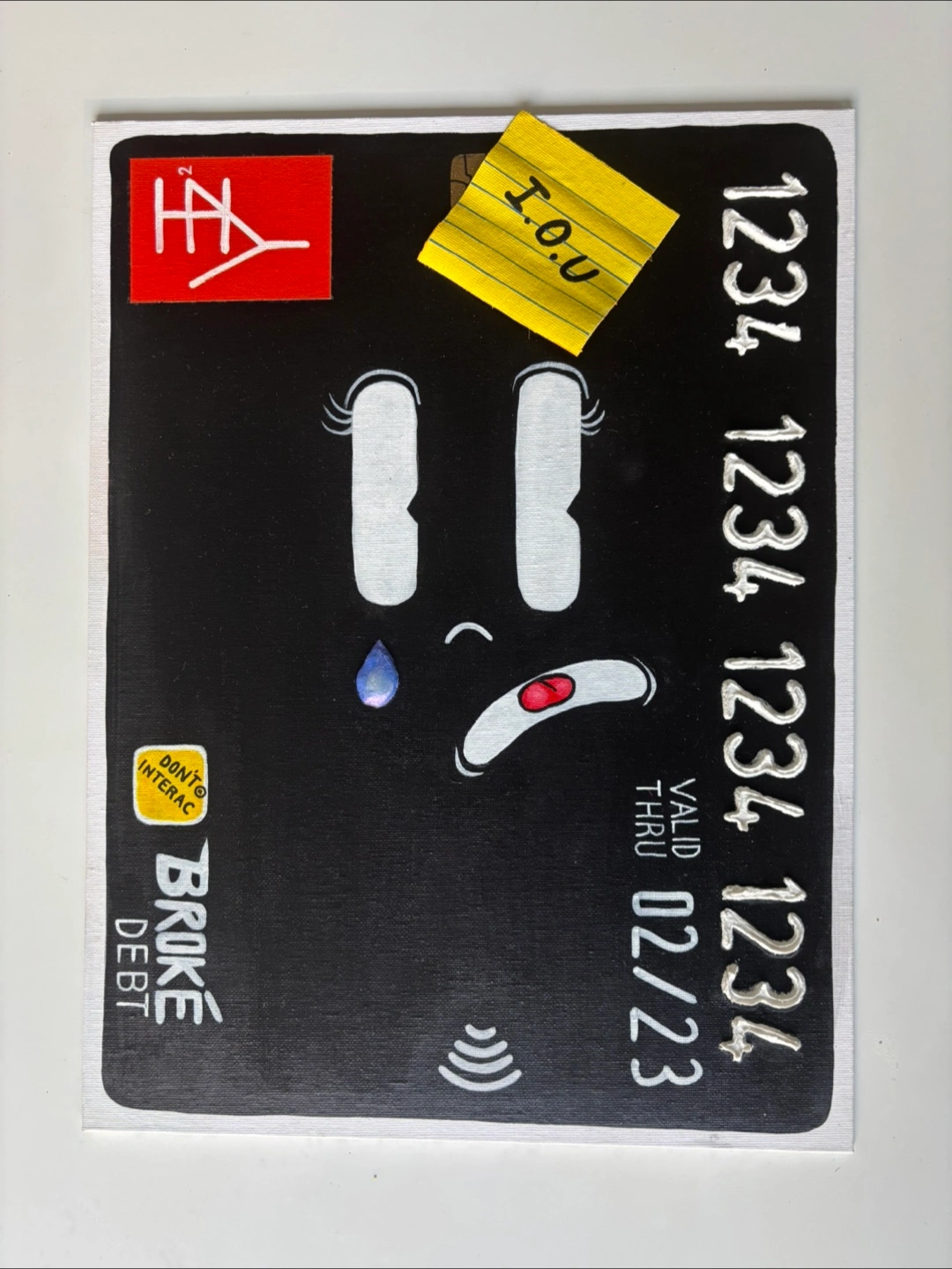 A piece from one of my post successful series/collections the “Tappy” collection, inspired by credit cards with similar details including raised numbers, chip, tap and other cheeky details like a raw canvas “post-it note” and a moulded 3D tear drop out of clay with a effervescent paint that shimmers.
