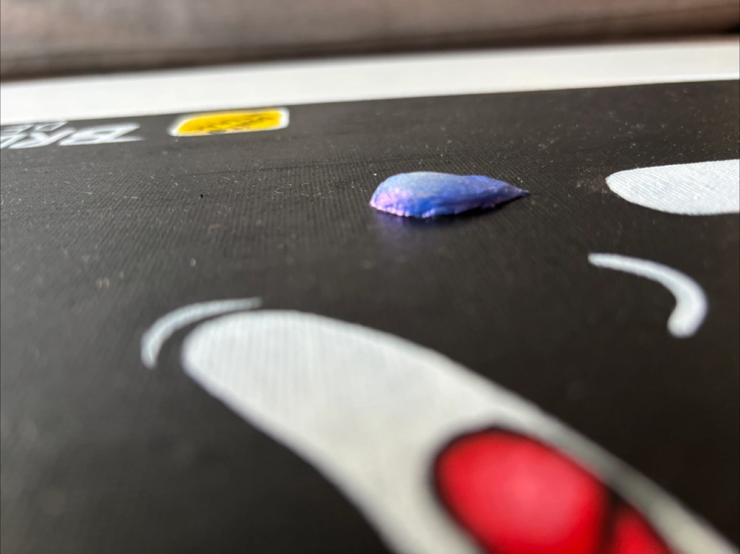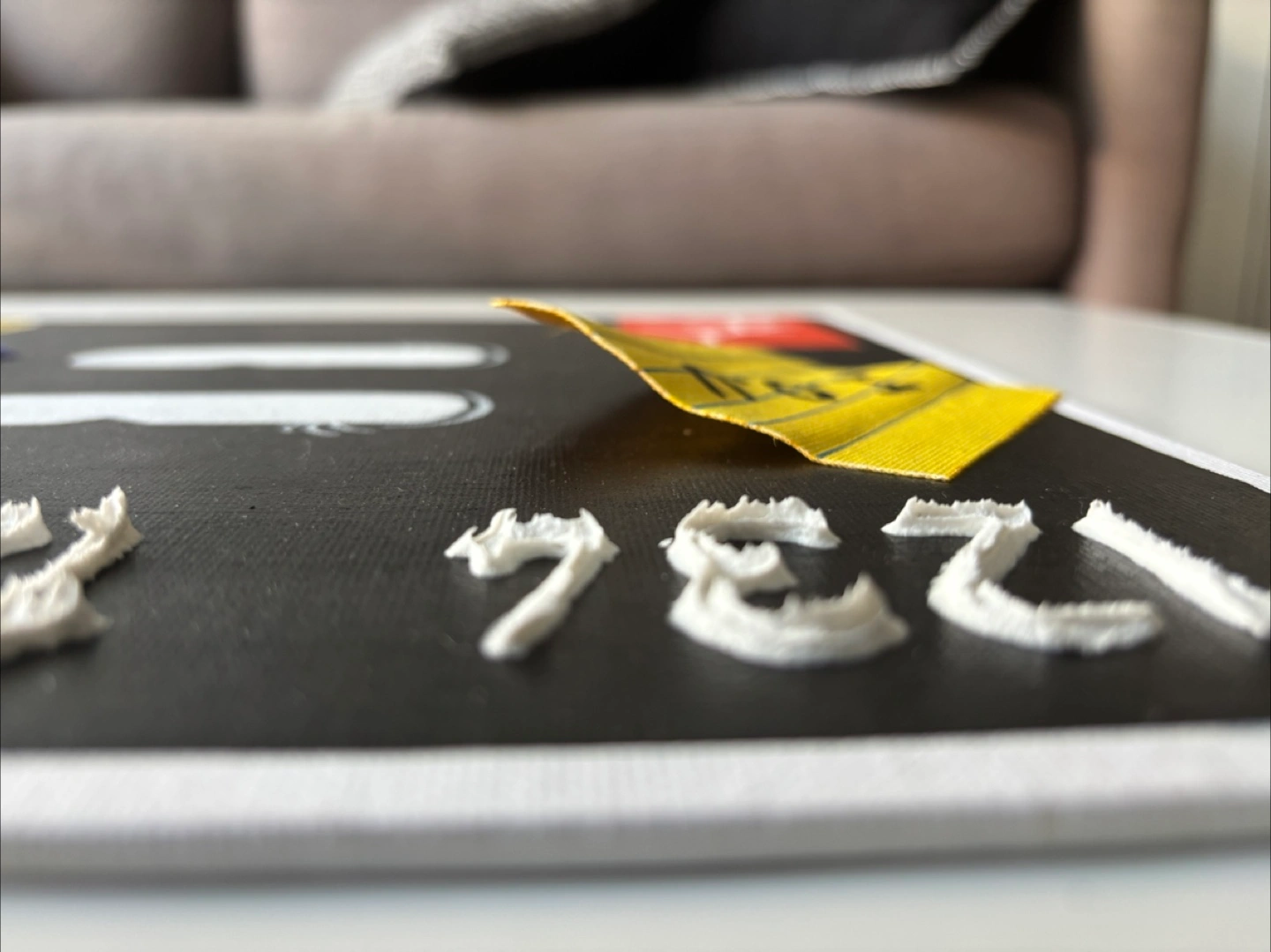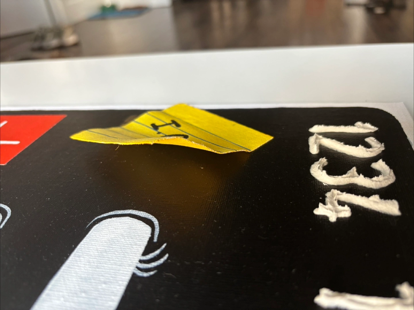 A piece from one of my post successful series/collections the “Tappy” collection, inspired by credit cards with similar details including raised numbers, chip, tap and other cheeky details like a raw canvas “post-it note” and a moulded 3D tear drop out of clay with a effervescent paint that shimmers.