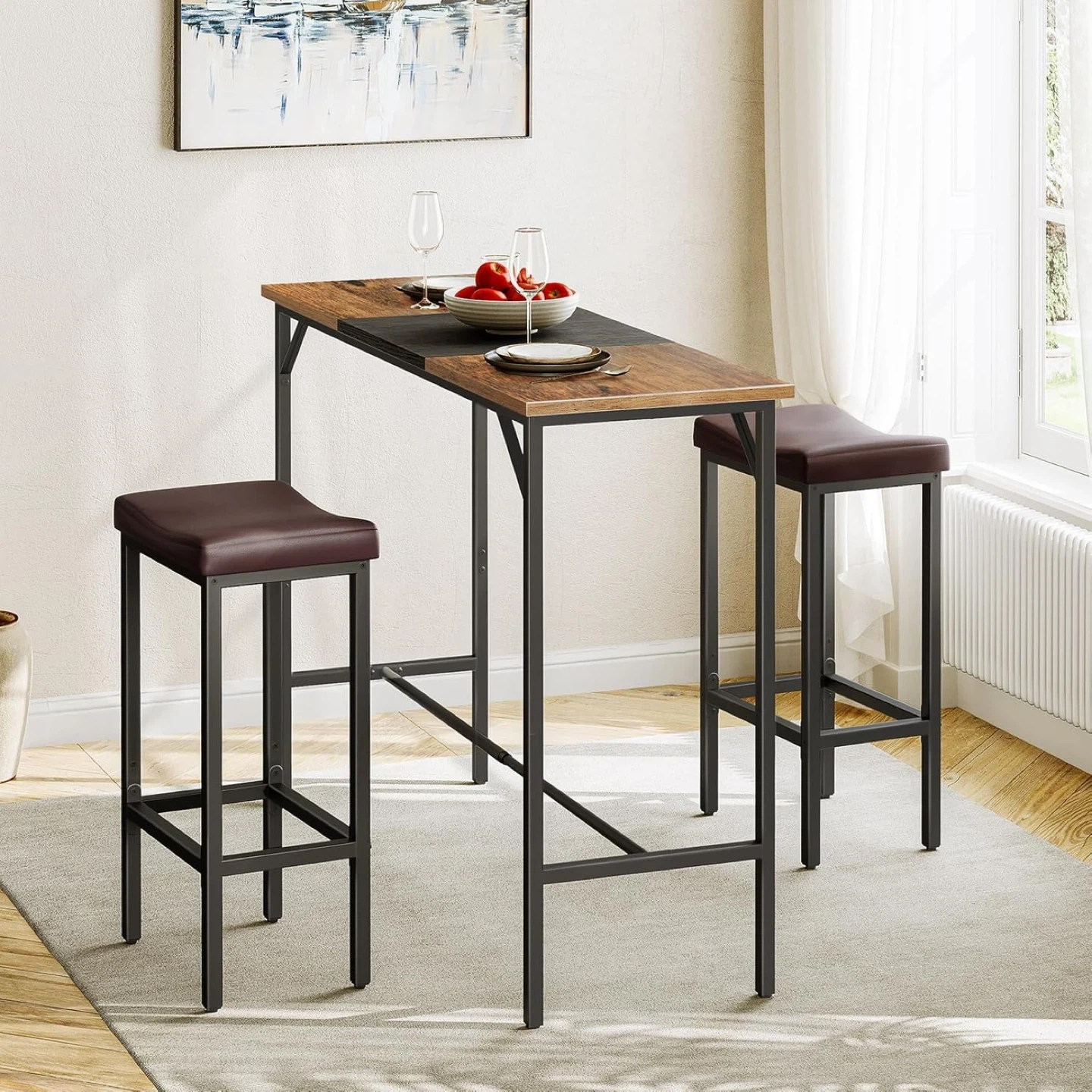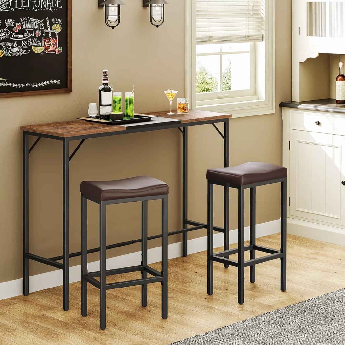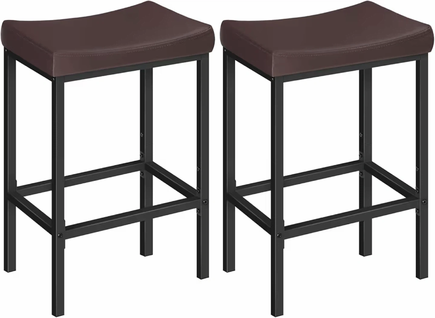 A set of two bar stools with brown faux leather saddle seats and black metal frames. The stool seats are 40cm/15.7" wide and 28cm/11" deep with a curved design. The overall height is 64cm/25.2", with a seat height of 35cm/15.8" and a footrest height of 18cm/7". These stools would fit well in a home bar or kitchen area.