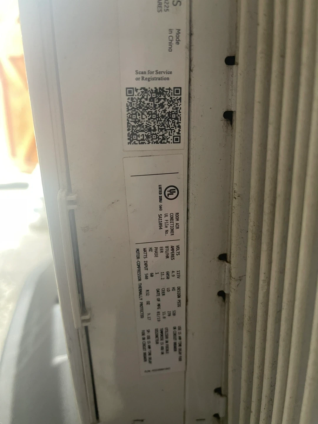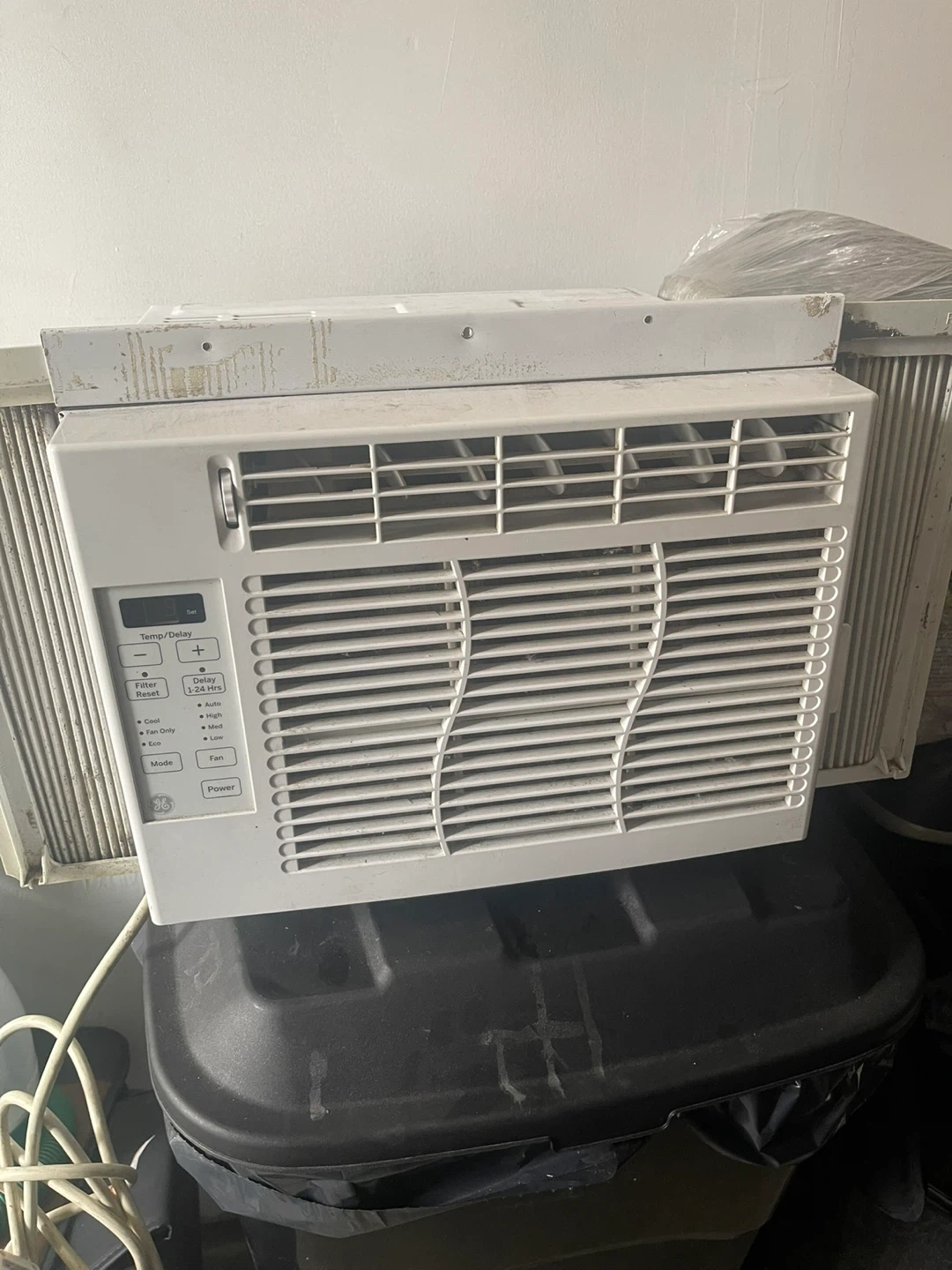 GE window air conditioner with digital controls. It's white and includes adjustable side panels. This unit is designed for window installation.
