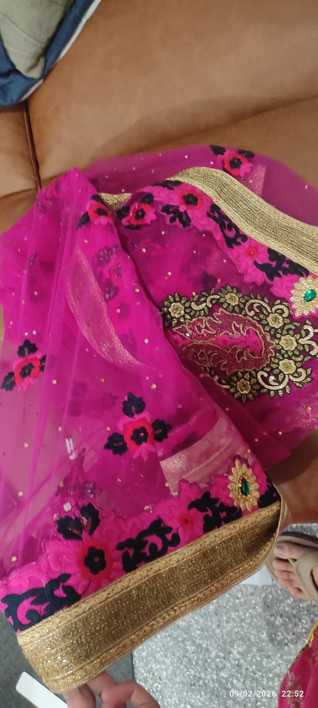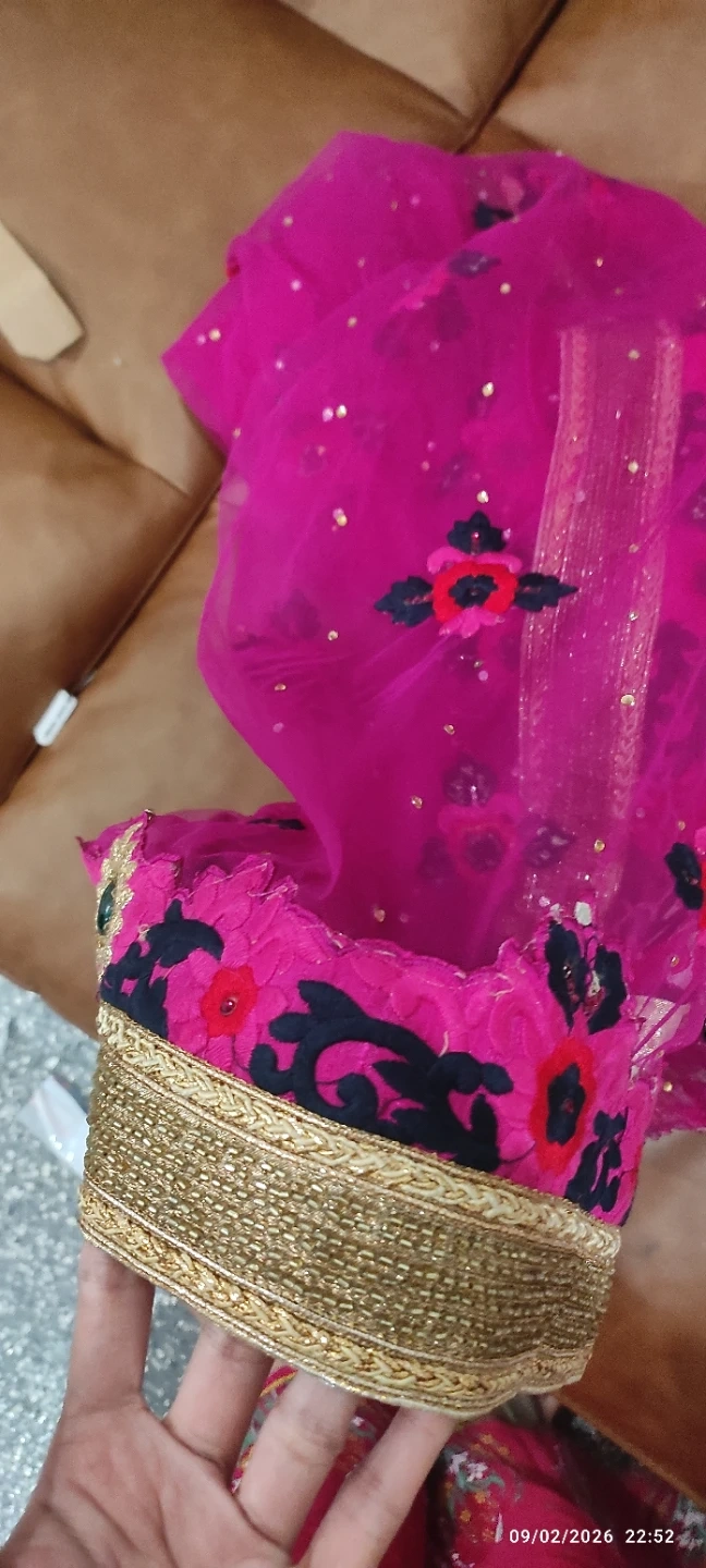 Beautiful pink net dupatta with intricate gold lace border and floral embroidery. It features sparkling sequins throughout the net fabric. Perfect for adding a touch of elegance to traditional outfits.
