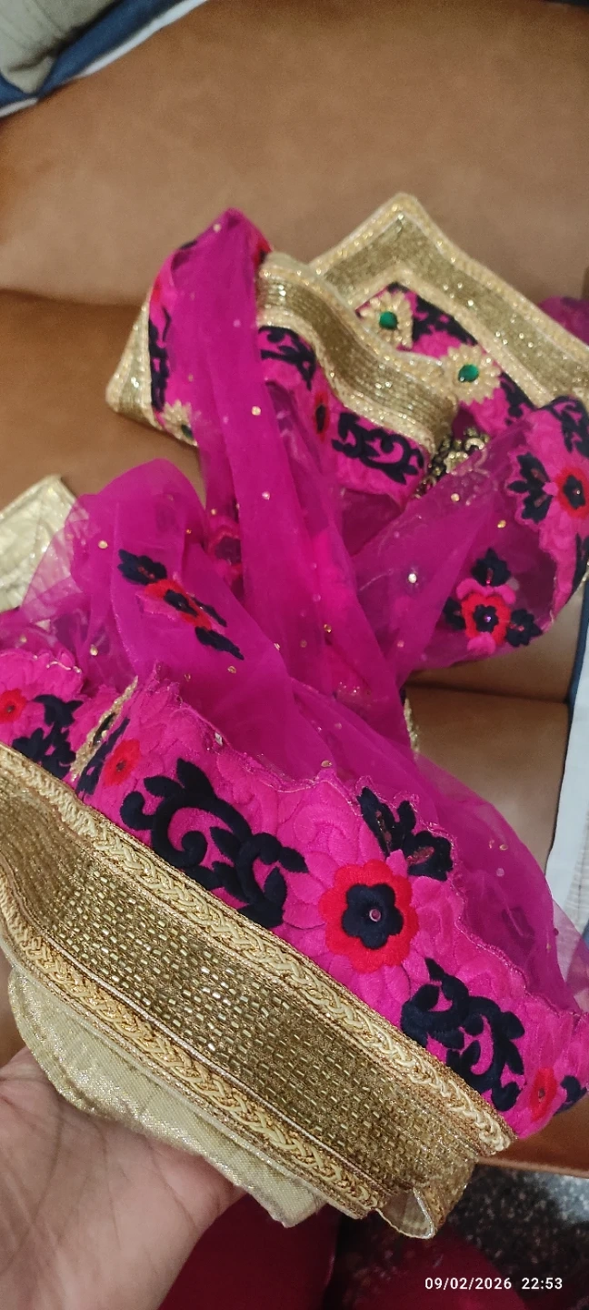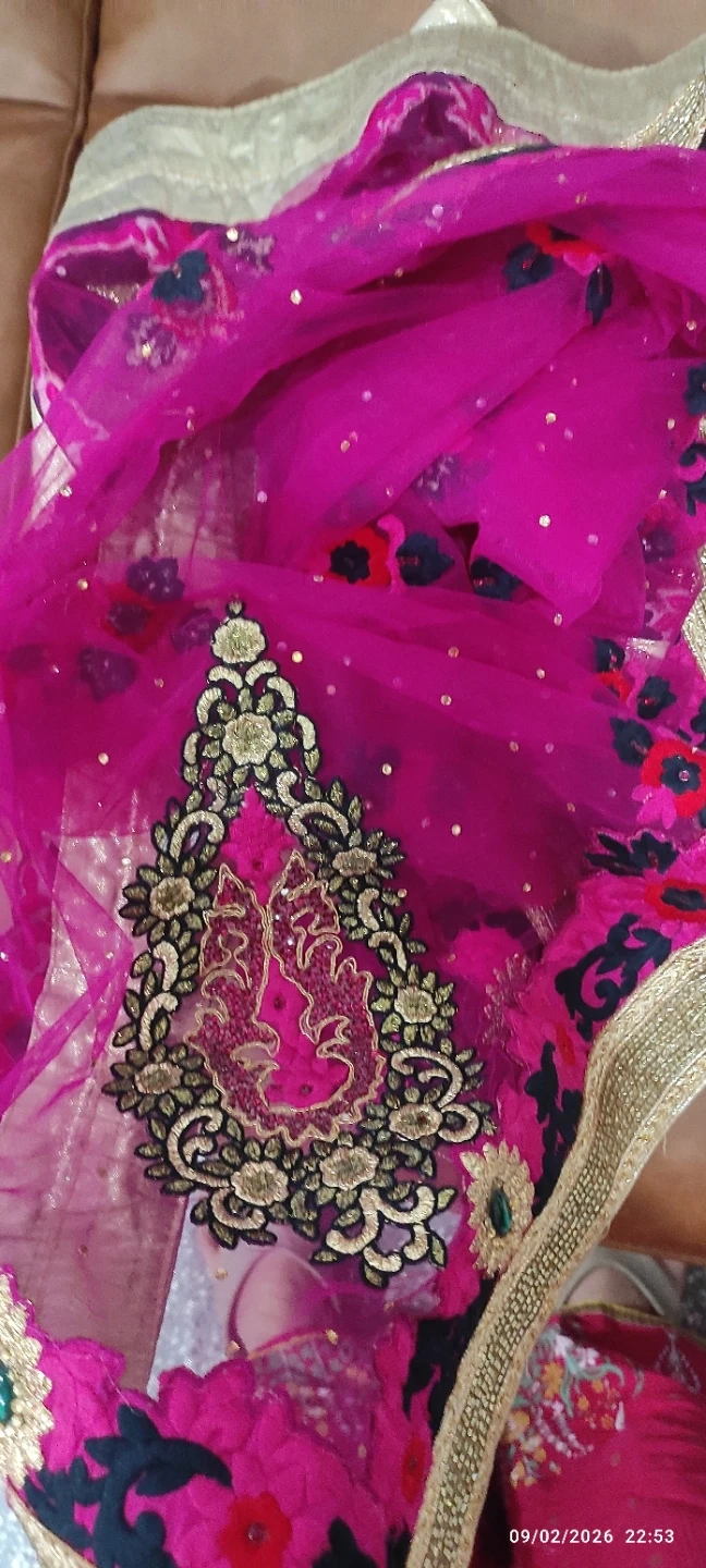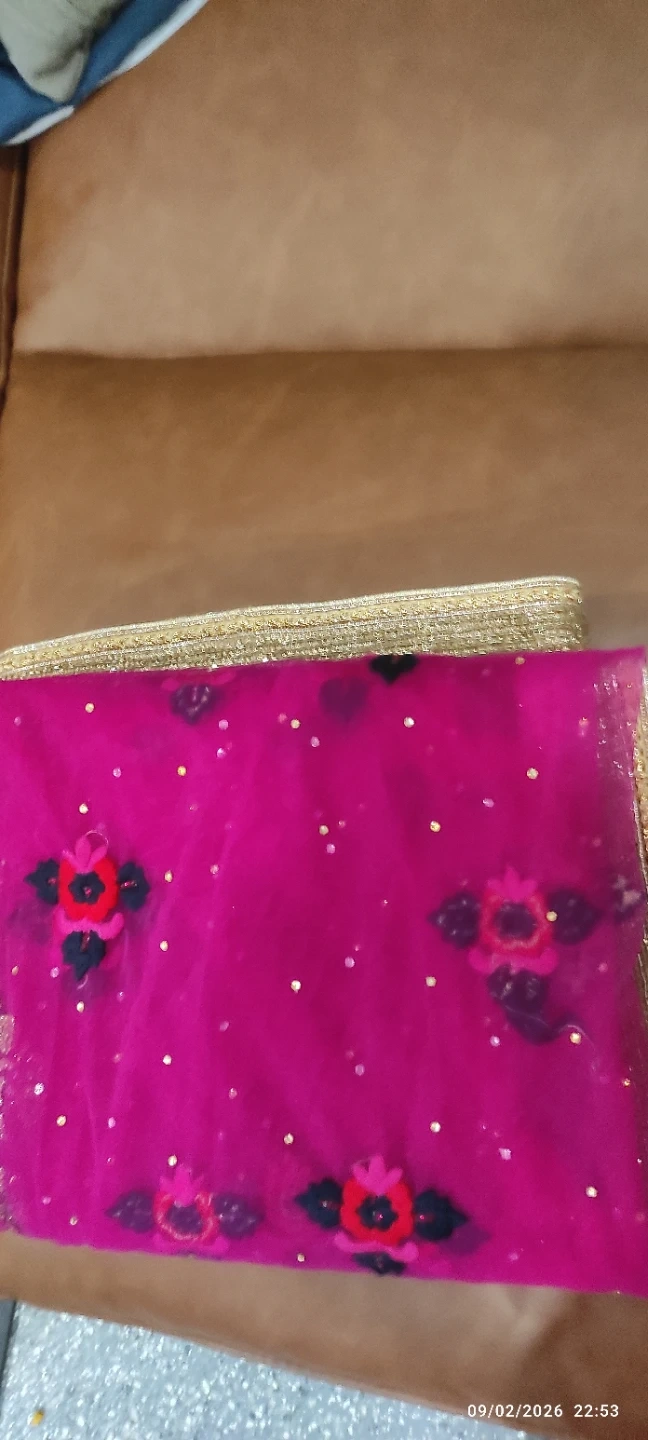 Beautiful pink net dupatta with intricate gold lace border and floral embroidery. It features sparkling sequins throughout the net fabric. Perfect for adding a touch of elegance to traditional outfits.