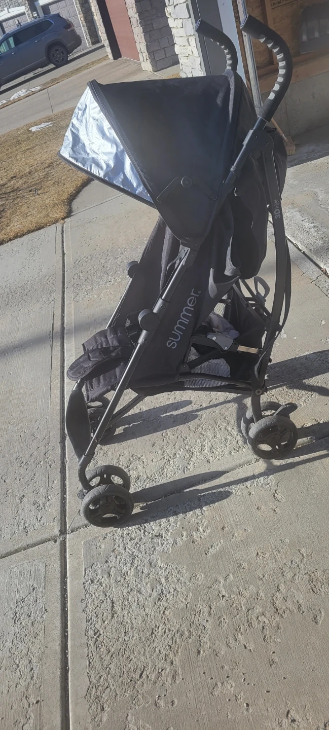 Lightweight black stroller with a canopy and safety harness. It's easy to fold for transport. Perfect for quick trips out and about!