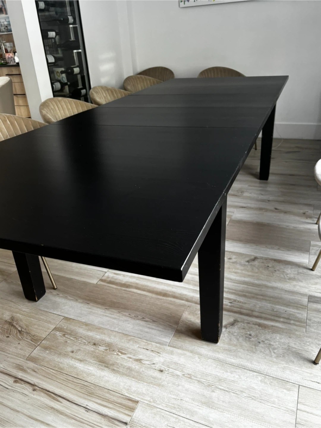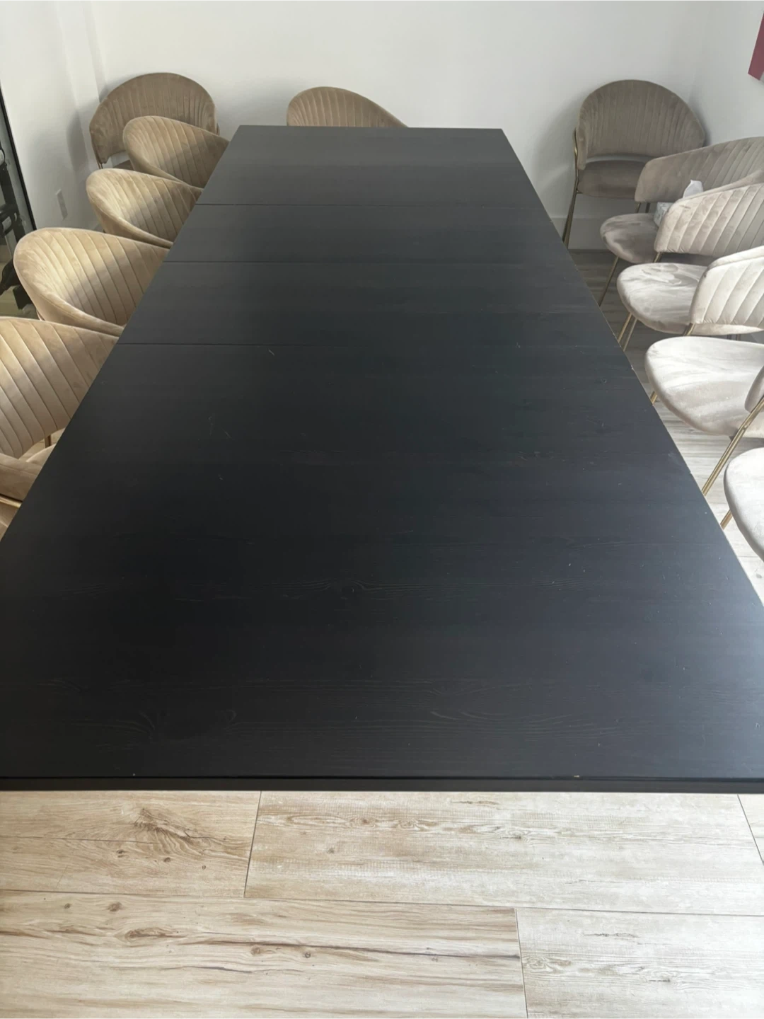 A long dining table with an extendable leaf. It's made of wood with a dark finish. This table seats up to 12 people when extended.