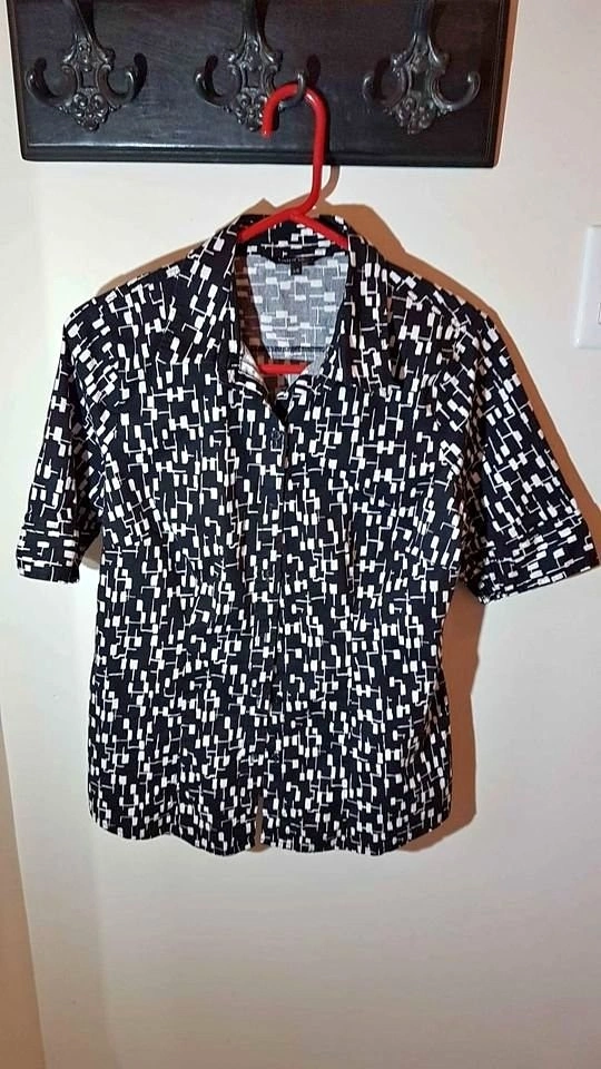 Women's Size Large George Black and White Cotton Blouse. Button front. Elastic detail on sleeves. Cotton and spandex blend. Washable. Has been washed. Smoke/pet free home. Pick up west end of Peterborough near Glenforest. $5