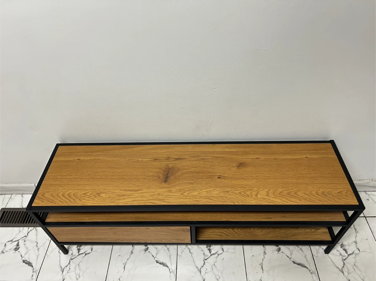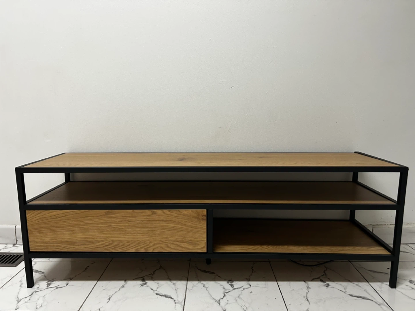 A stylish TV stand featuring a natural wood finish and a sturdy black metal frame. It has one drawer and an open shelf for storage. This stand would be great for organizing media consoles and accessories in your living room.