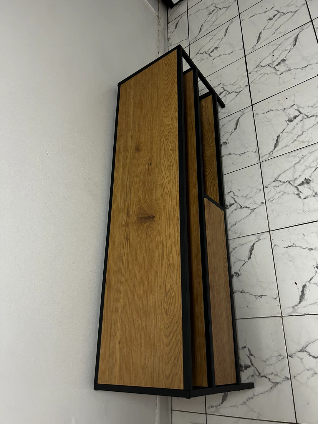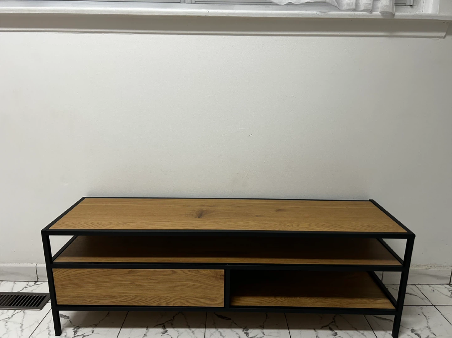 A stylish TV stand featuring a natural wood finish and a sturdy black metal frame. It has one drawer and an open shelf for storage. This stand would be great for organizing media consoles and accessories in your living room.