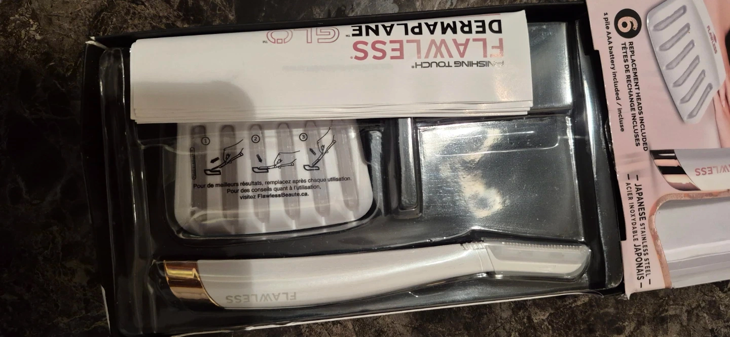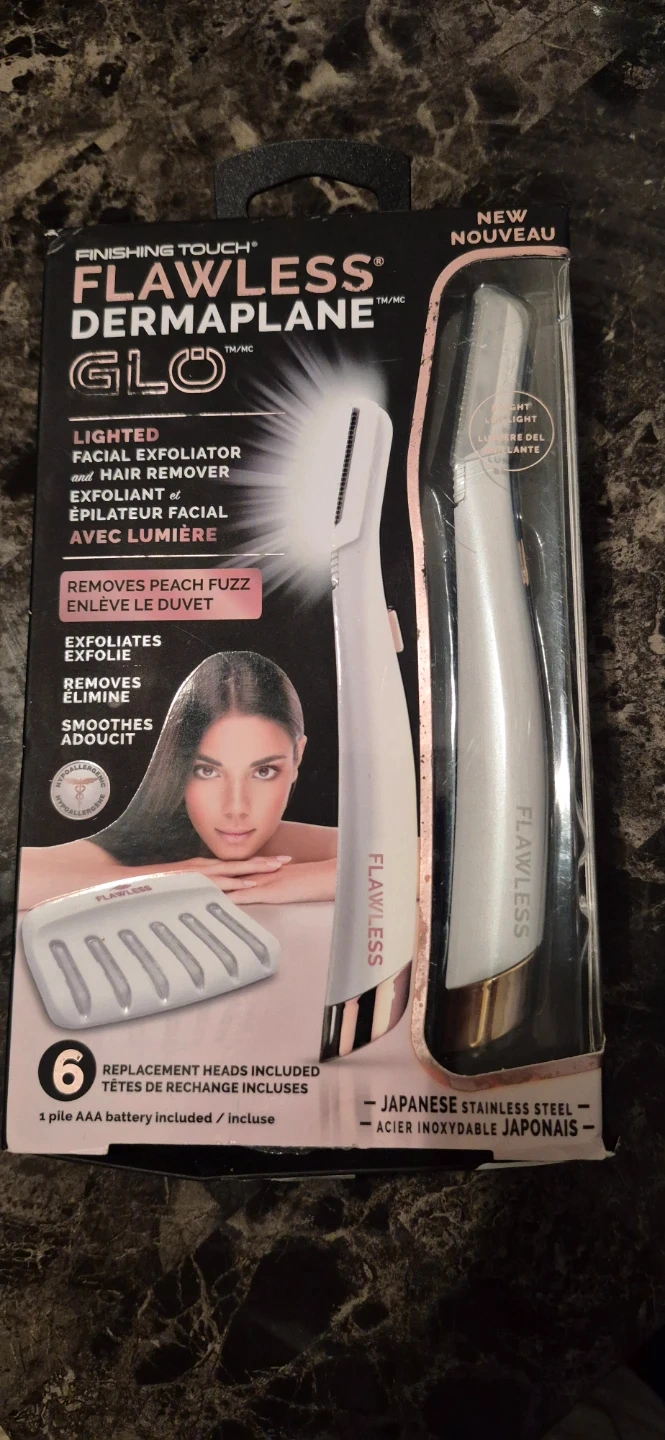 Selling a brand new Finishing Touch Flawless Dermaplane Glo! It's a lighted facial exfoliator and hair remover. The box includes 6 replacement heads and 1 AAA battery. It removes peach fuzz, exfoliates, eliminates, and smooths the skin its brand new never used just the box has some tairs on the top
