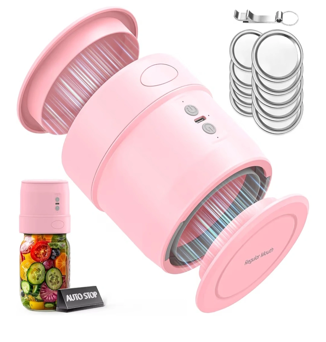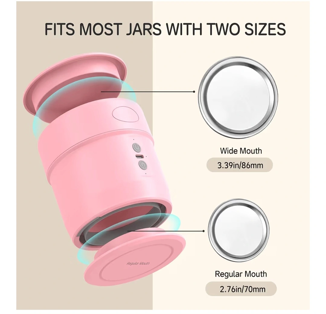 This is an electric jar sealer, perfect for canning enthusiasts! It fits most jars with two sizes: Wide Mouth (3.39in/86mm) and Regular Mouth (2.76in/70mm). It's in great condition and ready to help you preserve your favourite foods