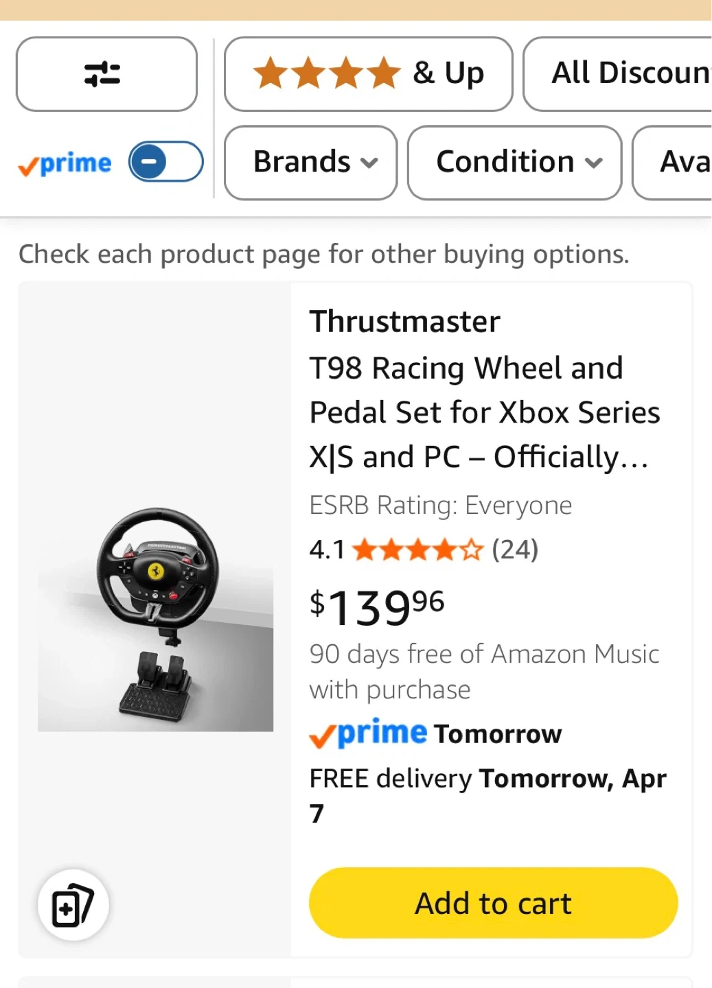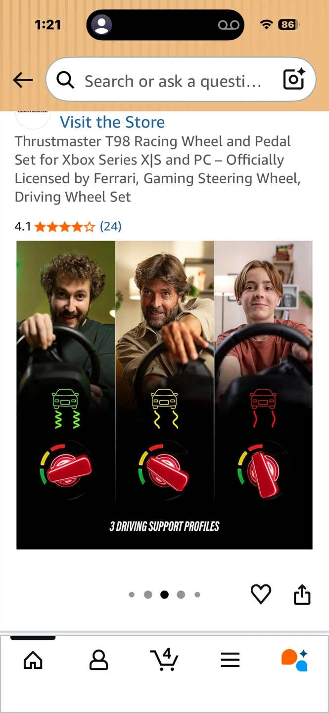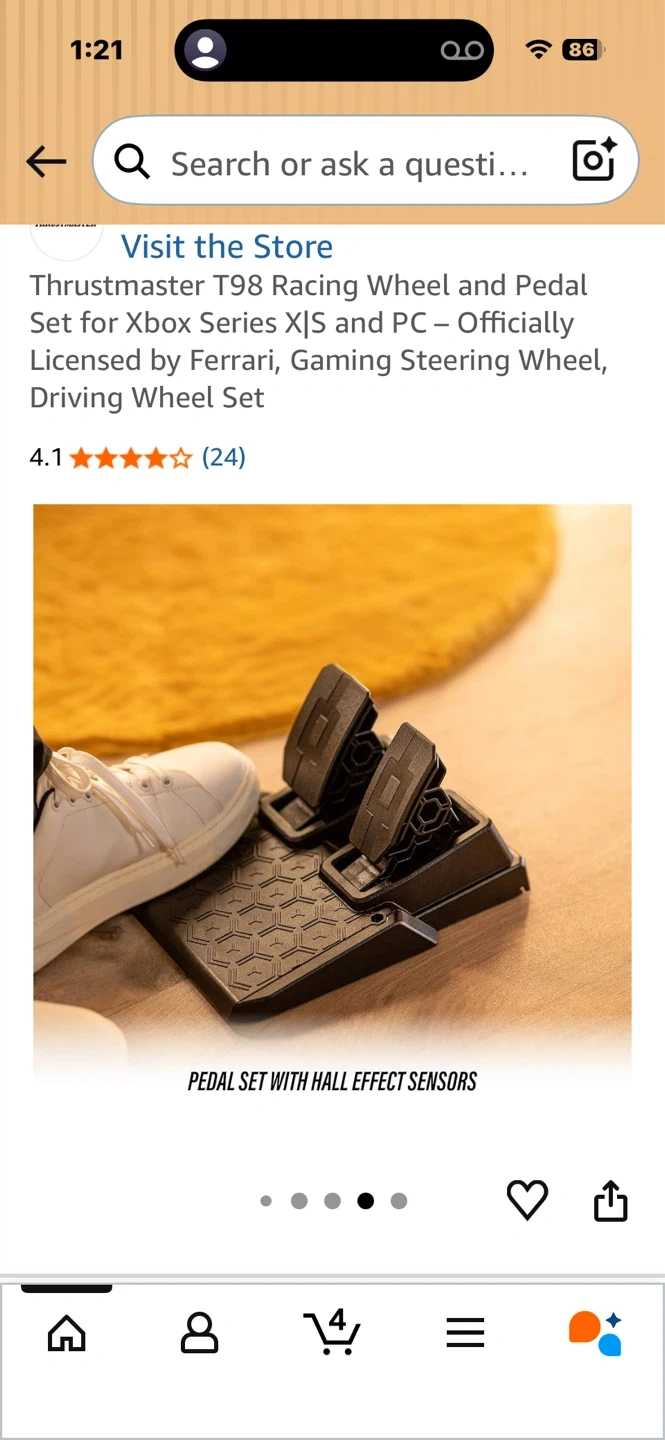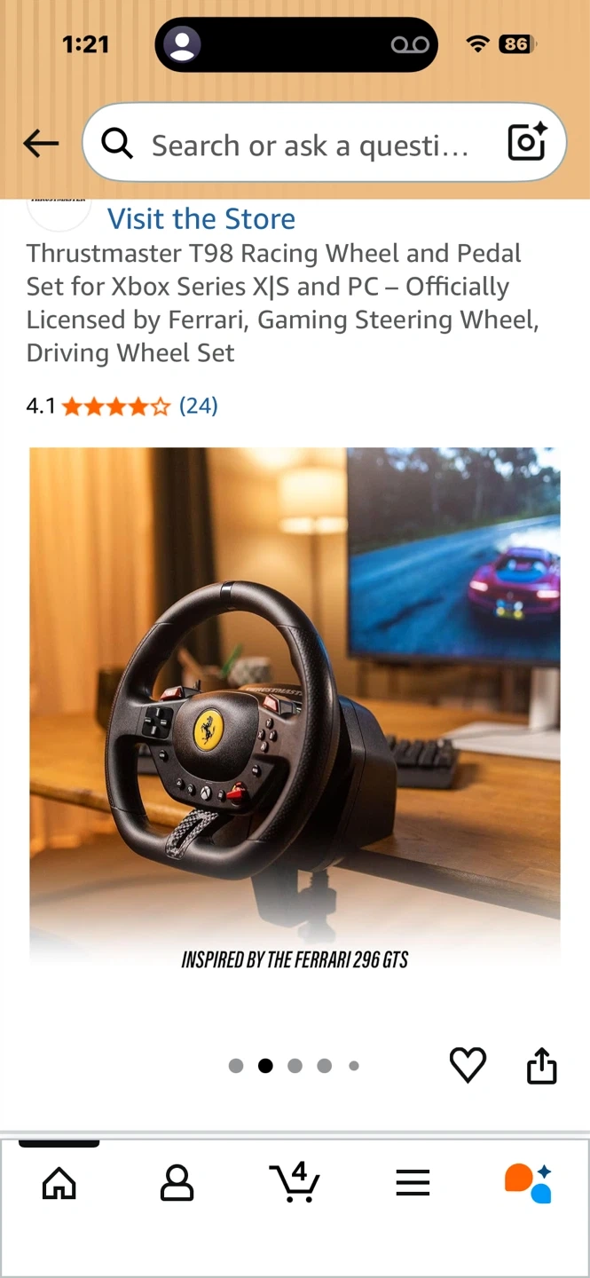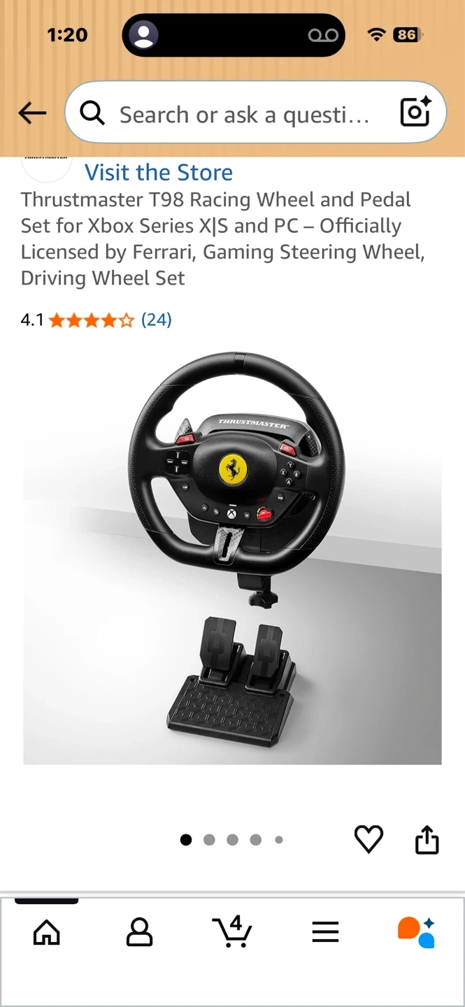 This is the Thrustmaster T98 racing wheel and pedal set. It's officially licensed by Ferrari and includes 3 driving support profiles. It's compatible with Xbox Series X|S and PC.
