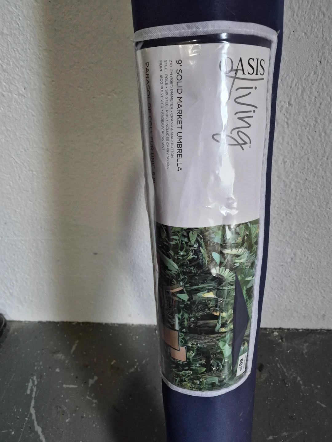 This is a 9-foot market umbrella with a 270 cm diameter. It features a steel pole, six steel ribs, and includes a carrying bag. The fabric is 180g fade and UV resistant polyester. It's perfect for providing shade on patios or decks.