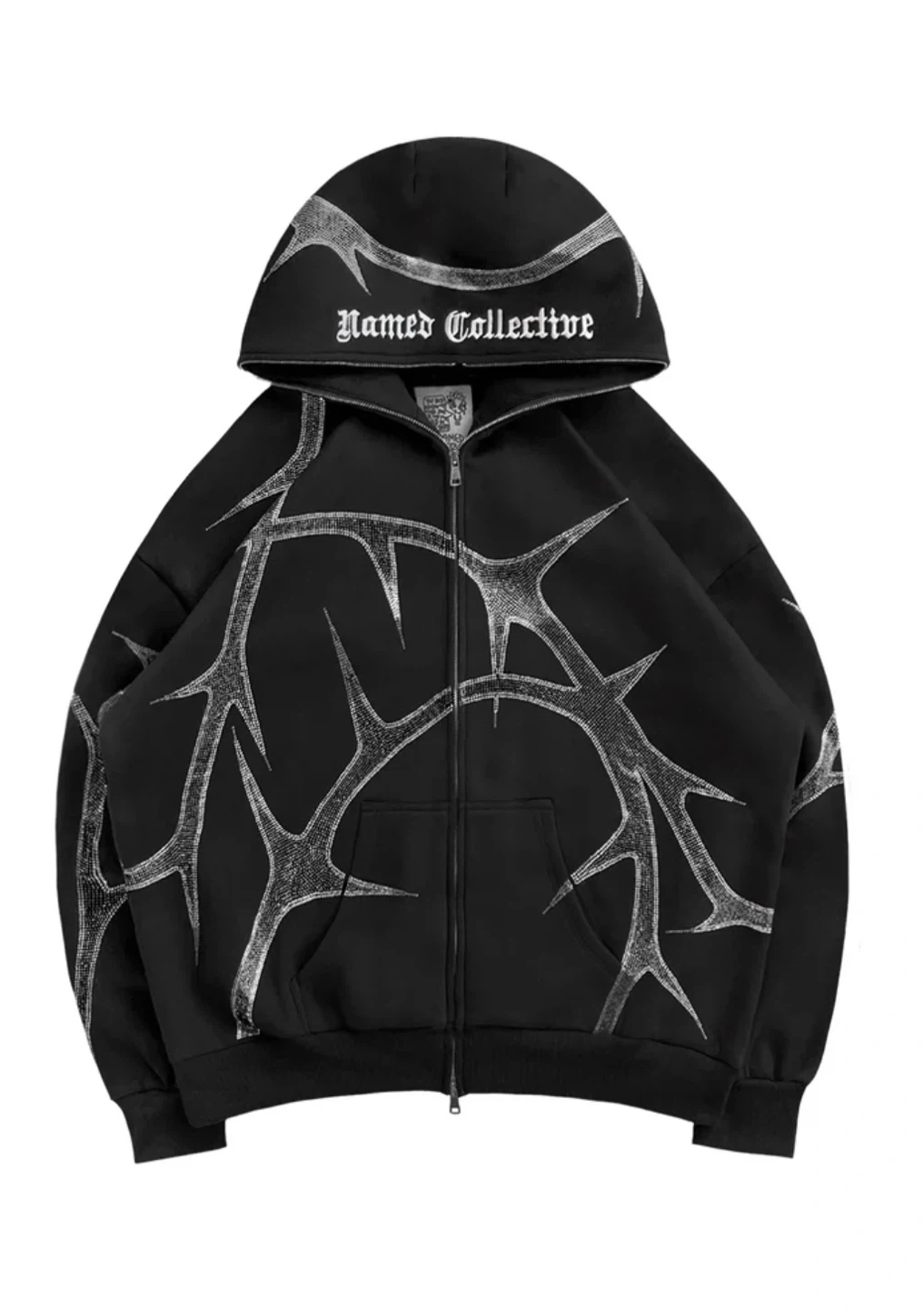 Named Collective zip-up hoodie in black. It's detailed with a silver thorn graphic on the front and back. The hoodie features a full zip closure and a drawstring hood. Great for layering or as a statement piece!