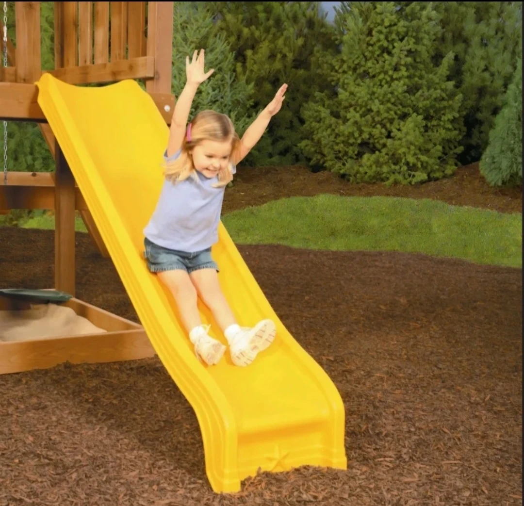 A bright yellow plastic slide for a playground set. It's designed for outdoor use and attaches to a swing set or play structure. This slide provides a fun way for kids to play outside!