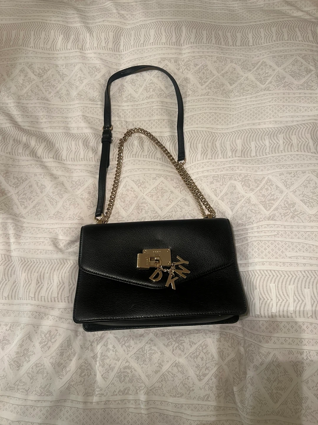 75This is a stylish DKNY shoulder bag in black leather. It's in great condition and ready for a new home! The bag features a gold-tone chain detail and the DKNY logo charm.