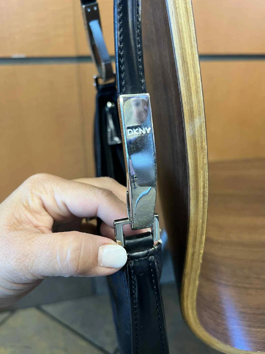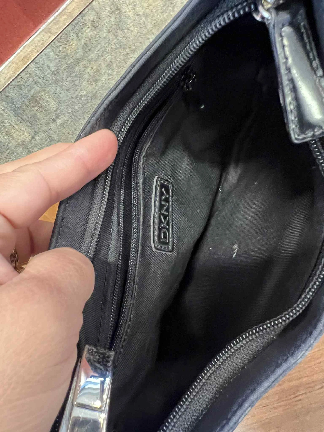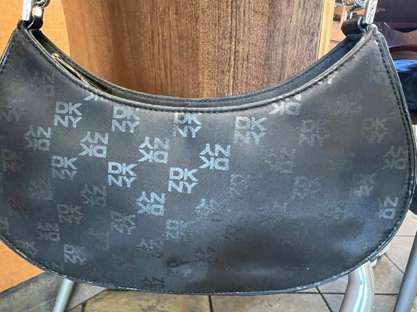 Looking to sell this DKNY shoulder bag. It's black with the DKNY logo printed throughout. It's in good condition and has a zipper closure. pick up bag very clean inside and out pick up or deliver