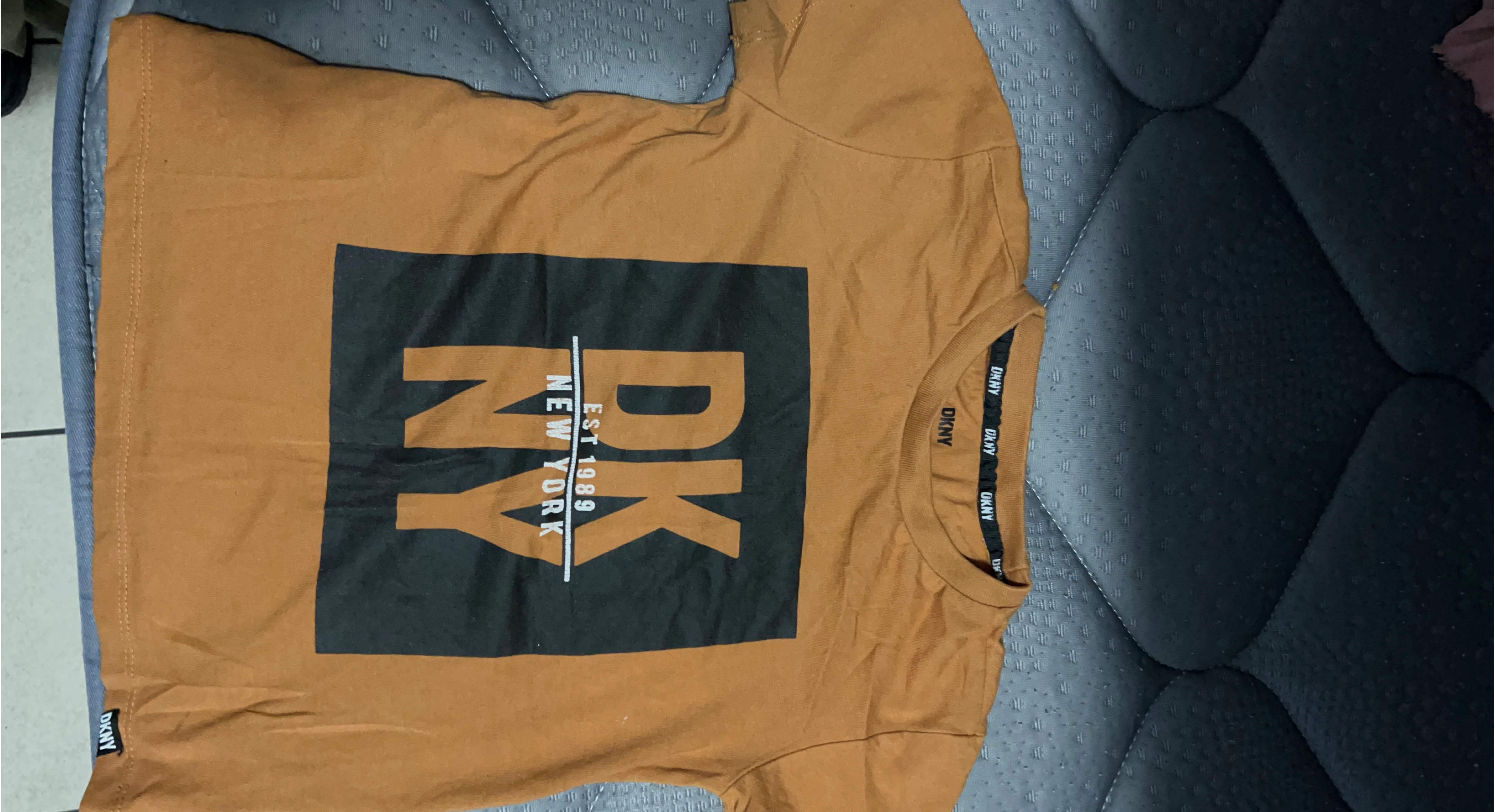 10Selling a DKNY brown t-shirt. It has a large black DKNY logo on the front. The shirt is in good condition and ready for a new home!