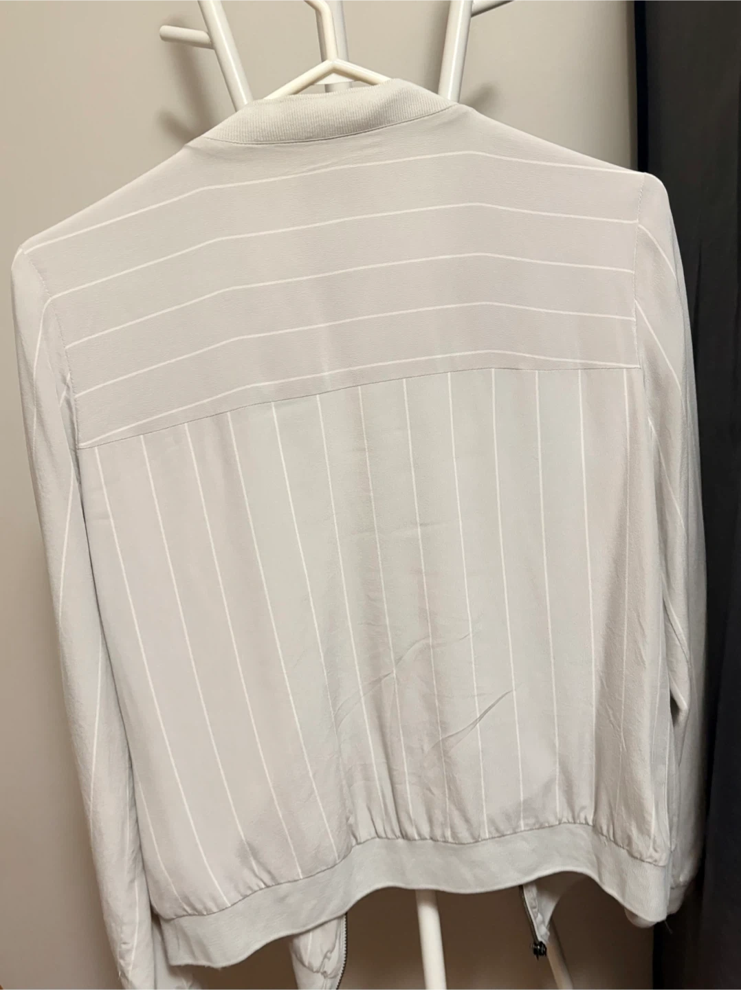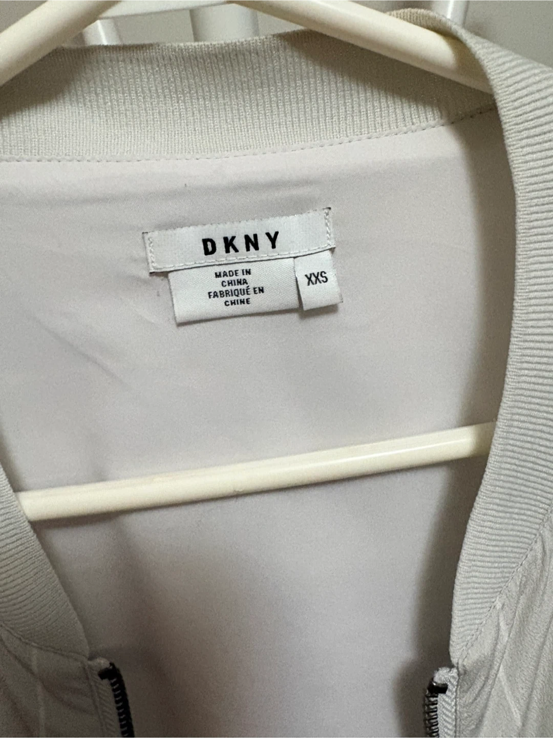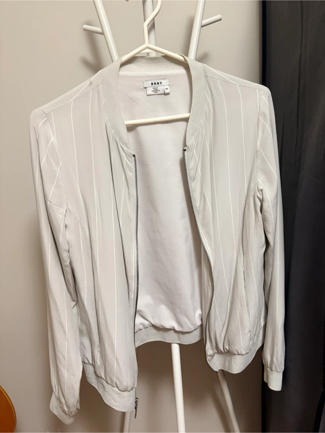 Selling a DKNY bomber jacket in size XXS. But it fits a small. It's a light grey colour with subtle stripes. Perfect for layering!