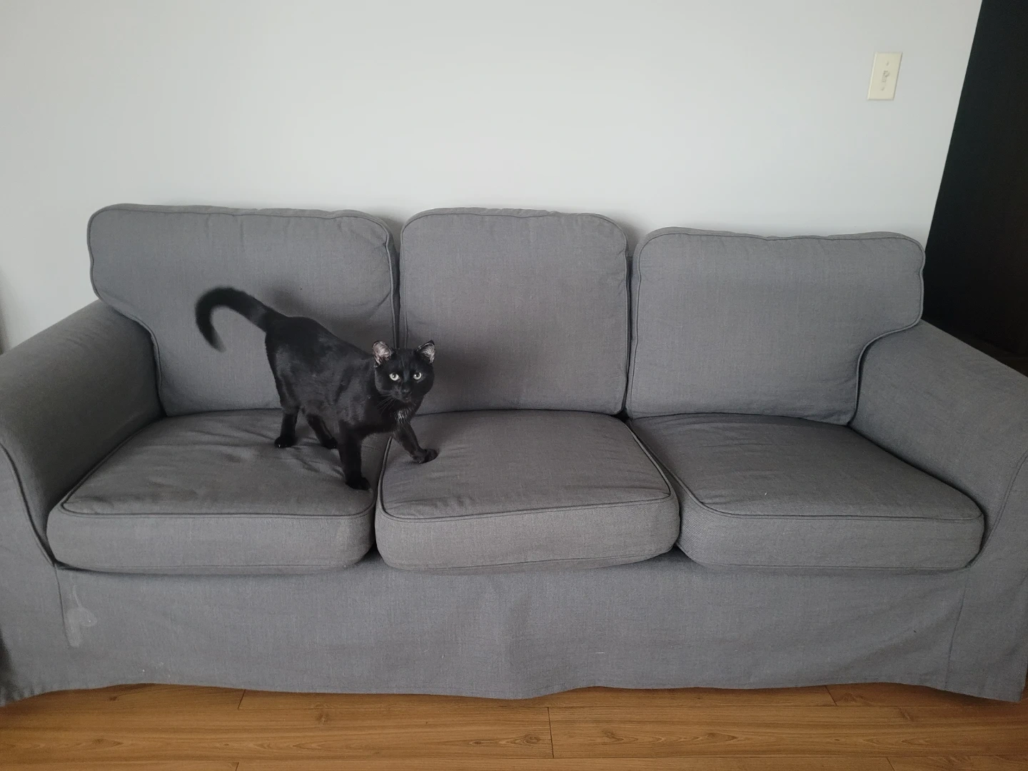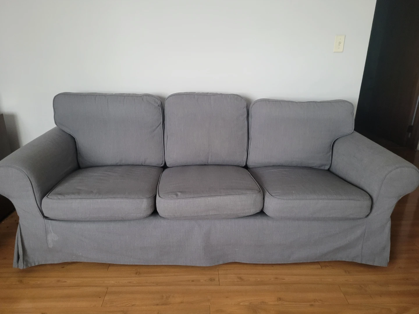 A grey three-seater sofa with a skirted base. It features comfortable cushions and a classic design. The fabric is a neutral grey, suitable for many home decors.