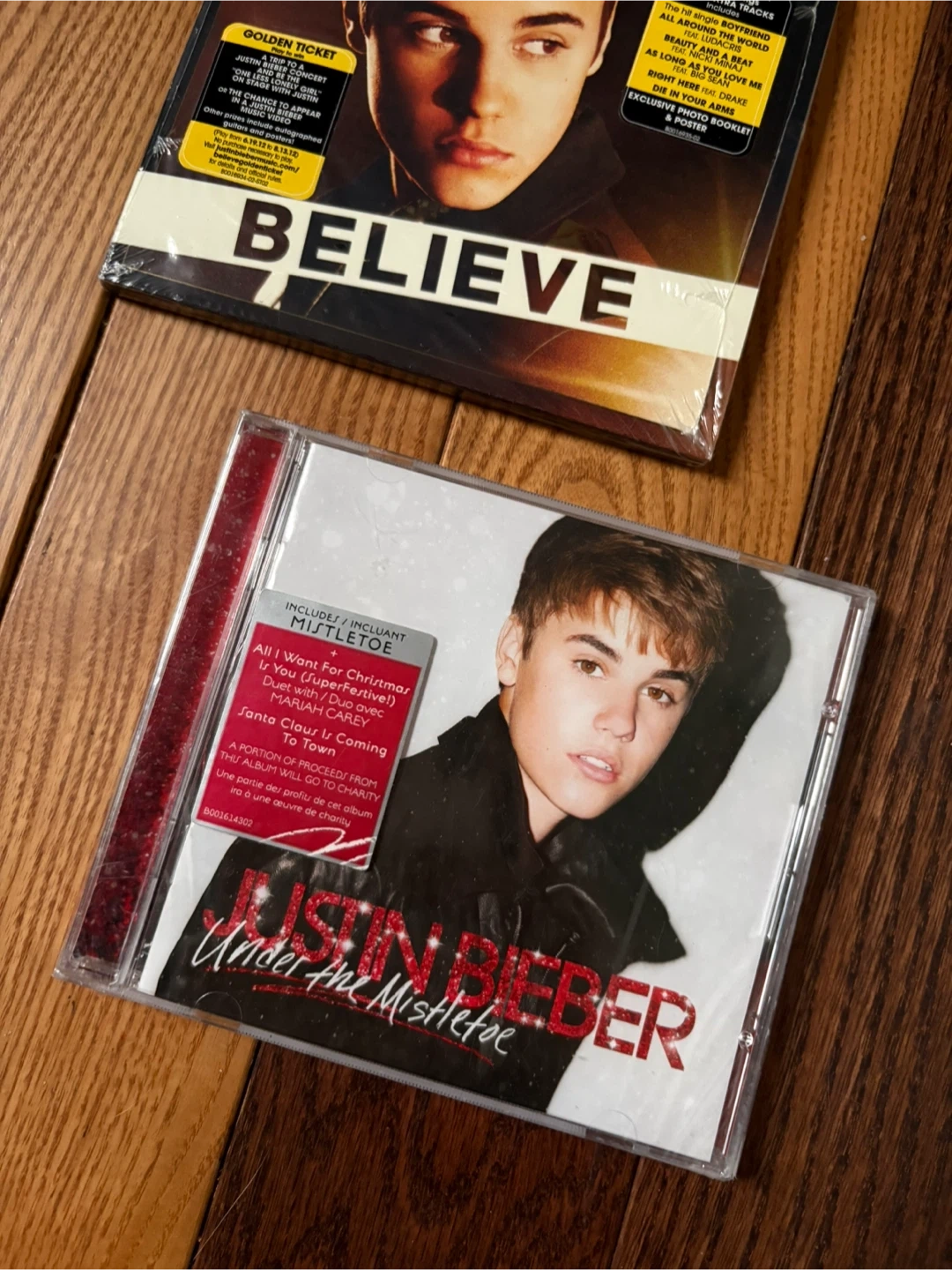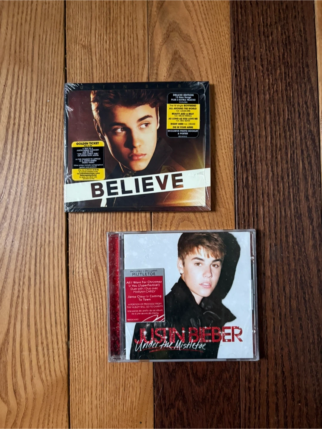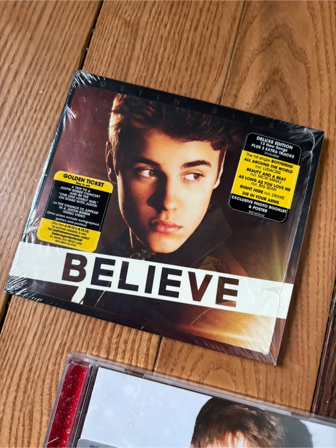 Deluxe edition CD of Justin Bieber's Believe album. It includes 13 extra tracks, a golden ticket, exclusive booklet, and poster. The 'Under the Mistletoe' CD is also included.