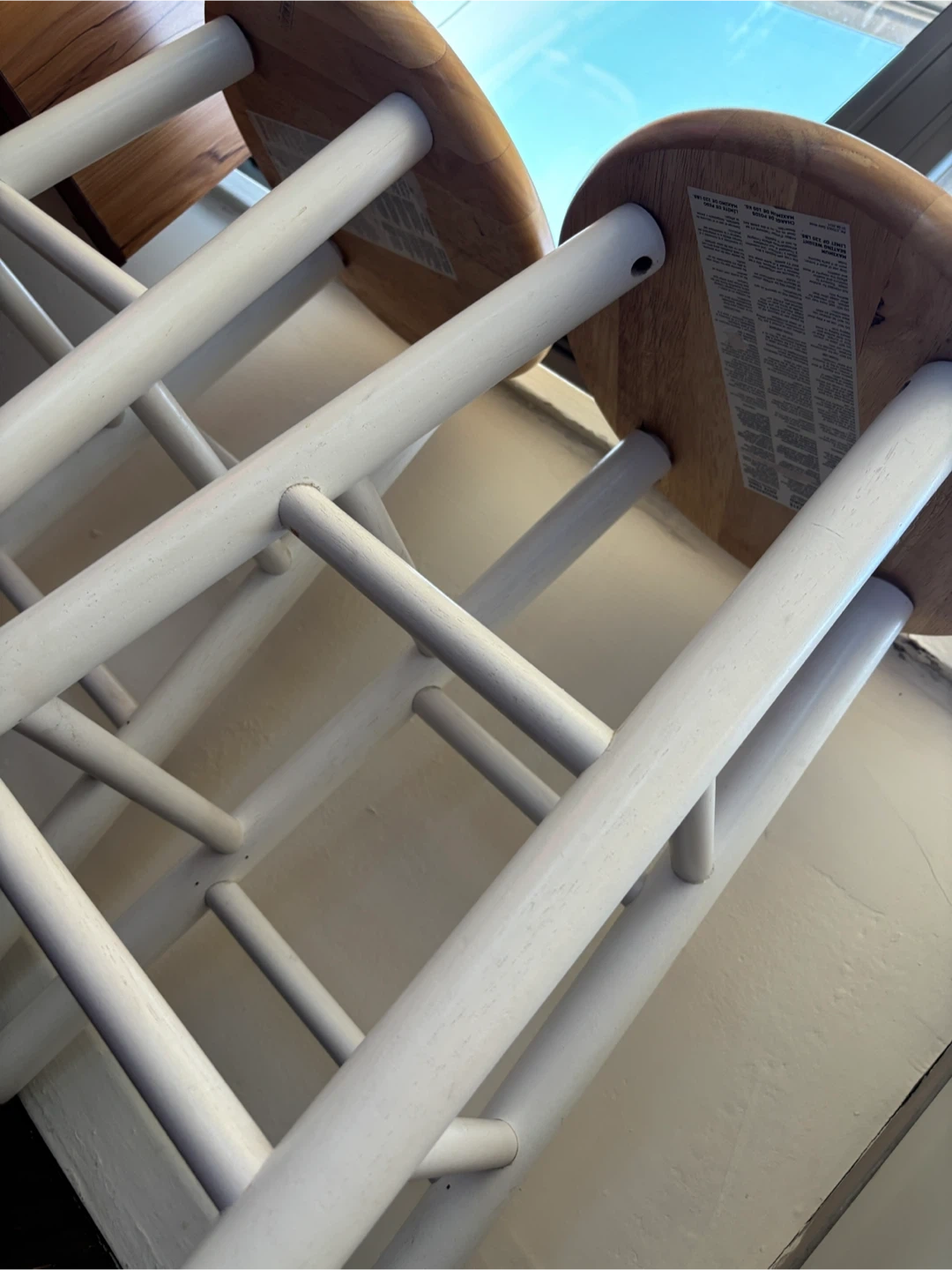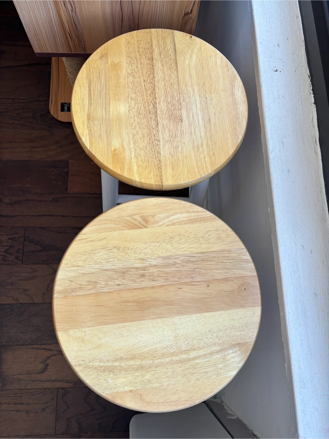 Two bar stools with light wood round seats and white legs. Perfect for a kitchen counter or home bar area. Sturdy construction.