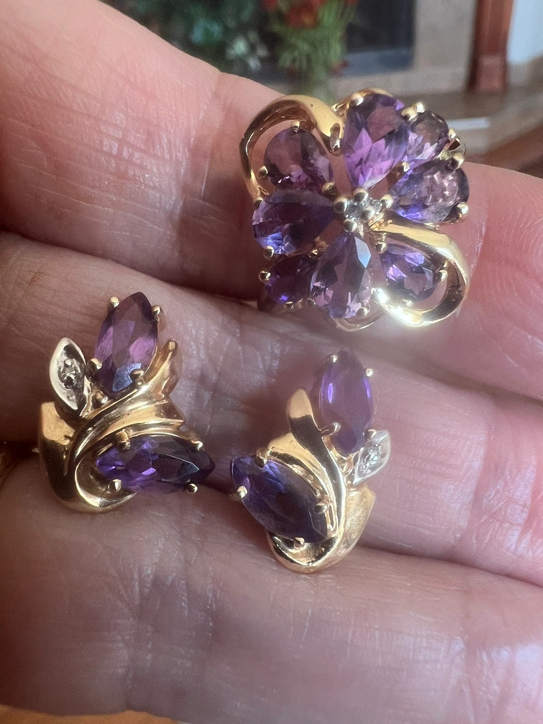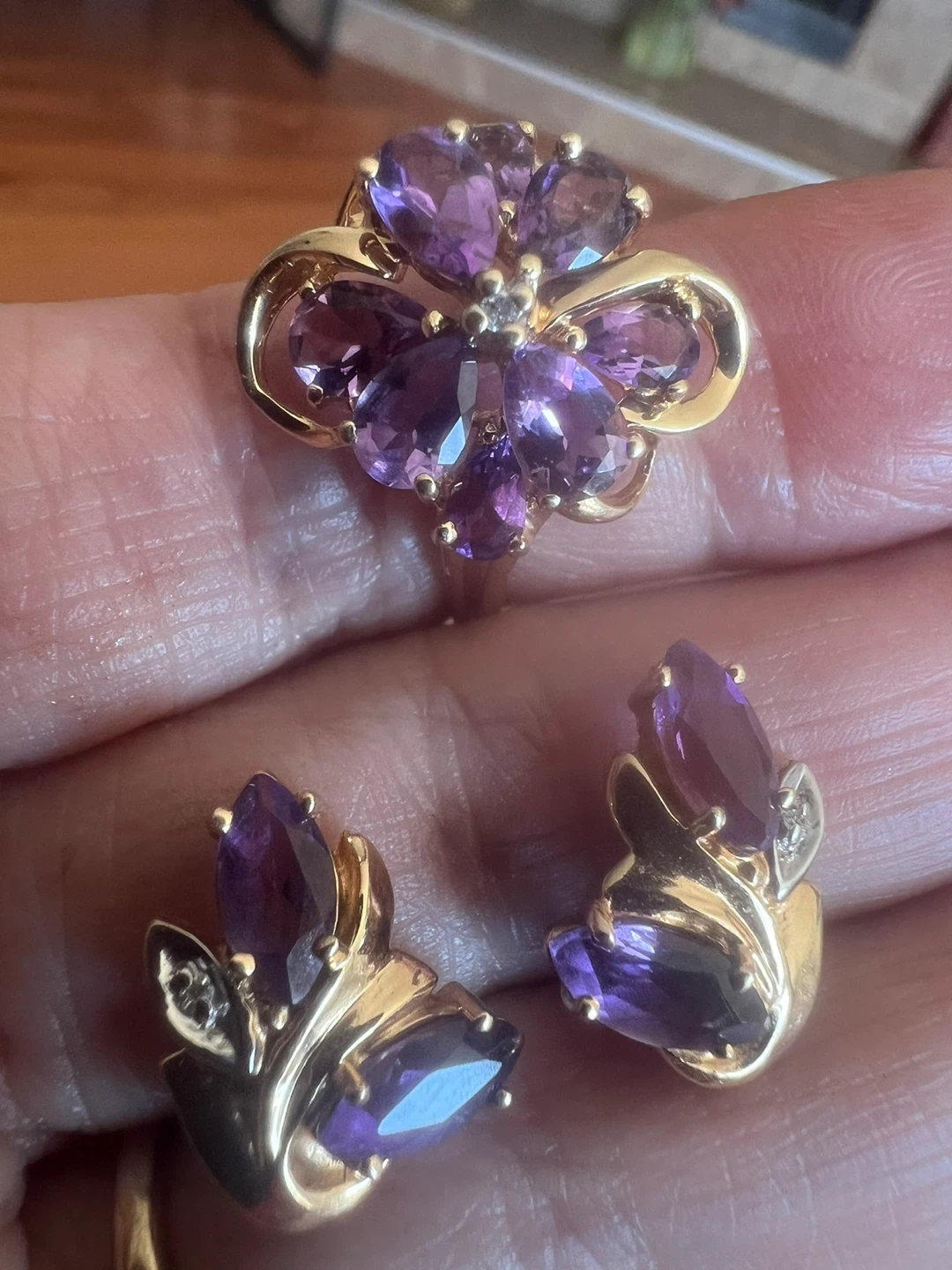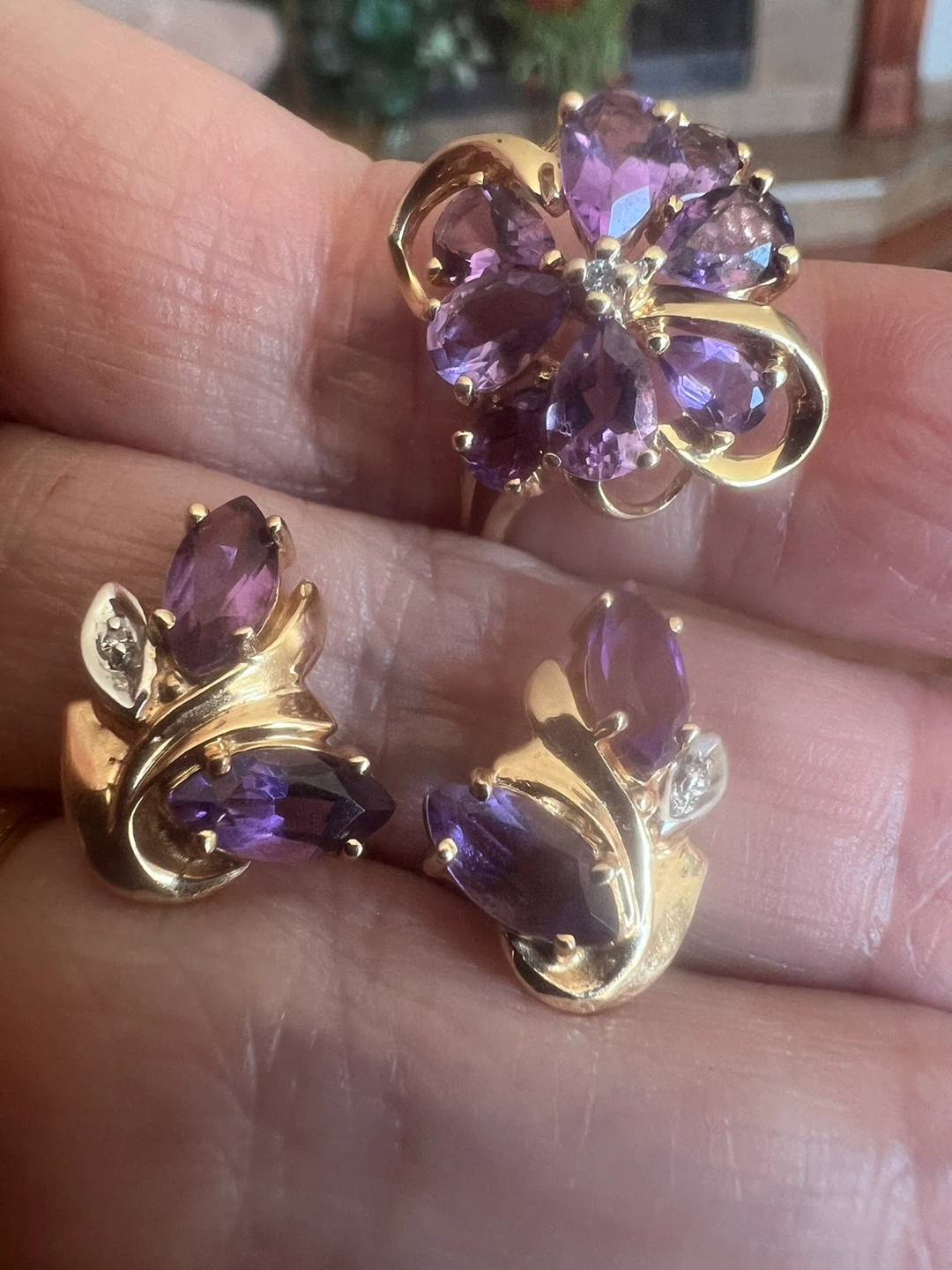 A lovely 14 k gold ring and matching 14 k earrings set featuring amethyst stones and small diamonds. The design is floral and elegant. Gold metal.