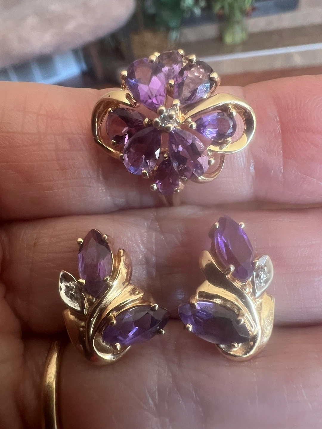 A lovely 14 k gold ring and matching 14 k earrings set featuring amethyst stones and small diamonds. The design is floral and elegant. Gold metal.