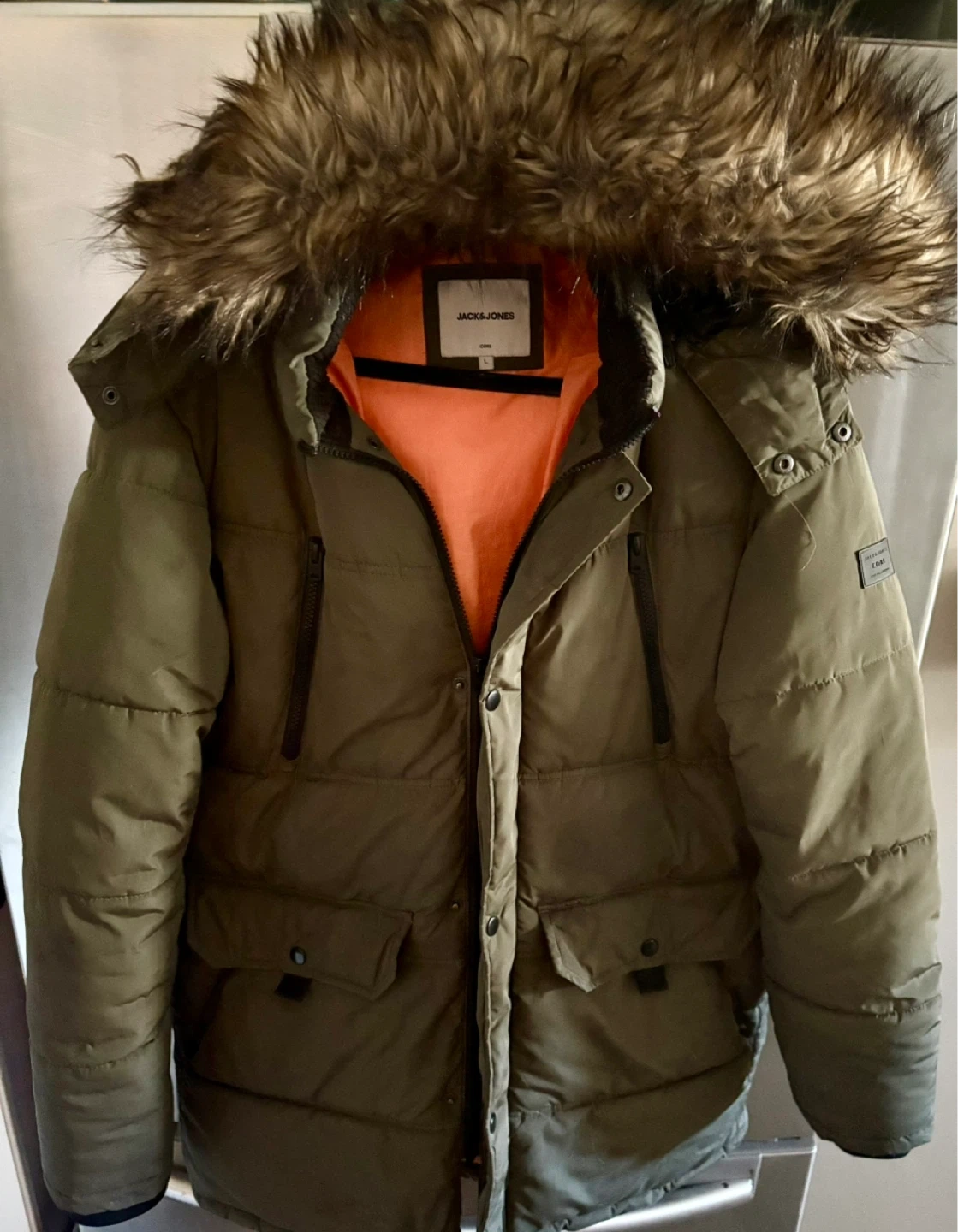 This Jack & Jones puffer jacket is designed for warmth and protection. It's windproof and features a detachable hood with faux fur trim. The jacket includes a storm cuff and is made from durable materials.