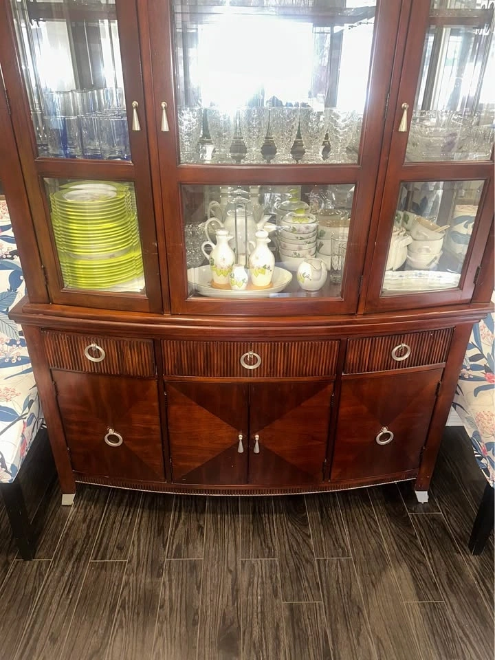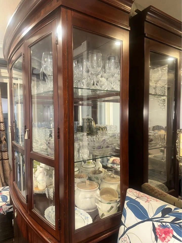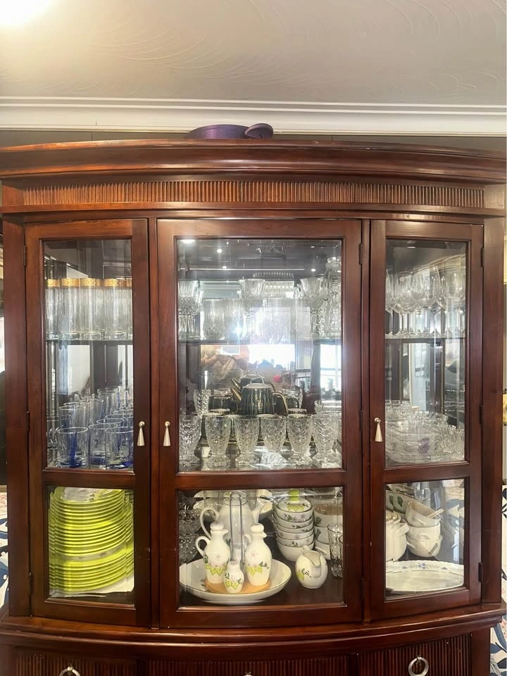 Absolutely stunning solid wood curved Italian cabinet/hutch with glass display doors and built-in shelving. The craftsmanship on this piece is next level with rich wood tones, elegant curved design, and detailed finishes that you simply do not see in modern furniture anymore.