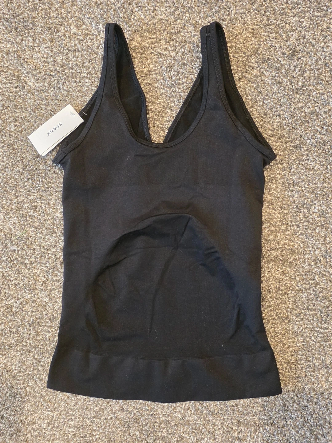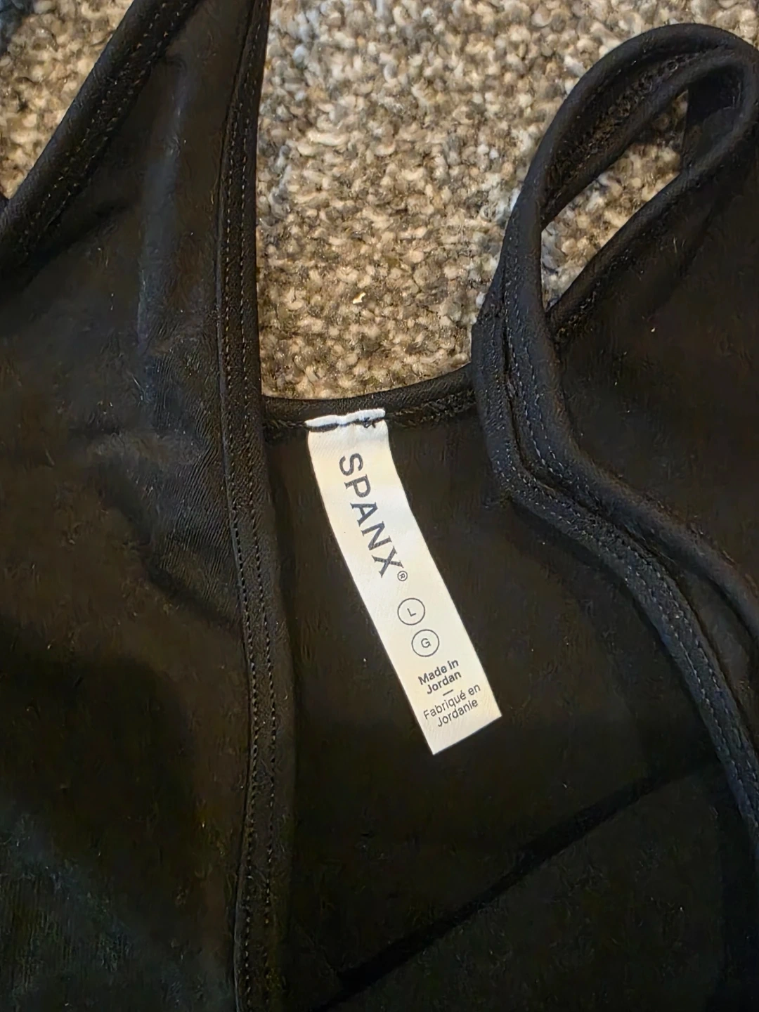 This is a black compression tank top from SPANX. It's a size Large. Material is soft and stretchy. Brand new! Color is Very Black.
