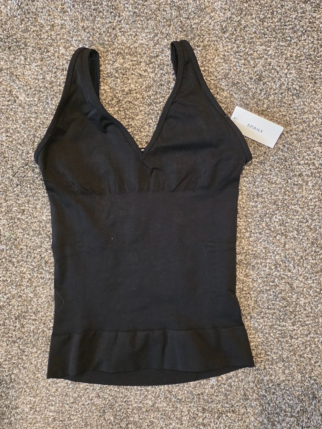 This is a black compression tank top from SPANX. It's a size Large. Material is soft and stretchy. Brand new! Color is Very Black.