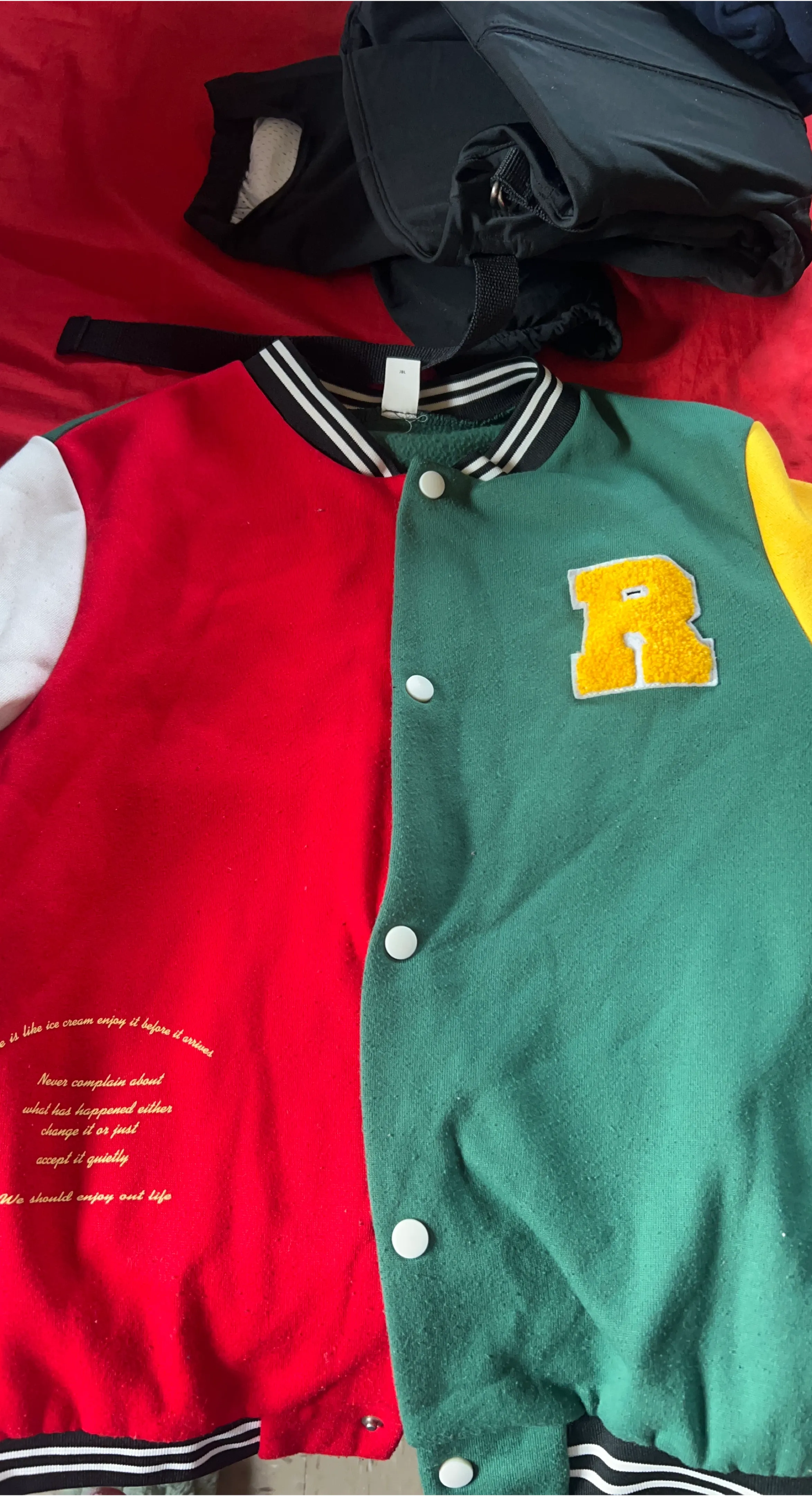 Selling a fun varsity jacket with a unique color block design! It features red, green, and yellow panels, along with a prominent 'R' patch. The jacket also has some interesting text embroidered on it: "We should enjoy out life."