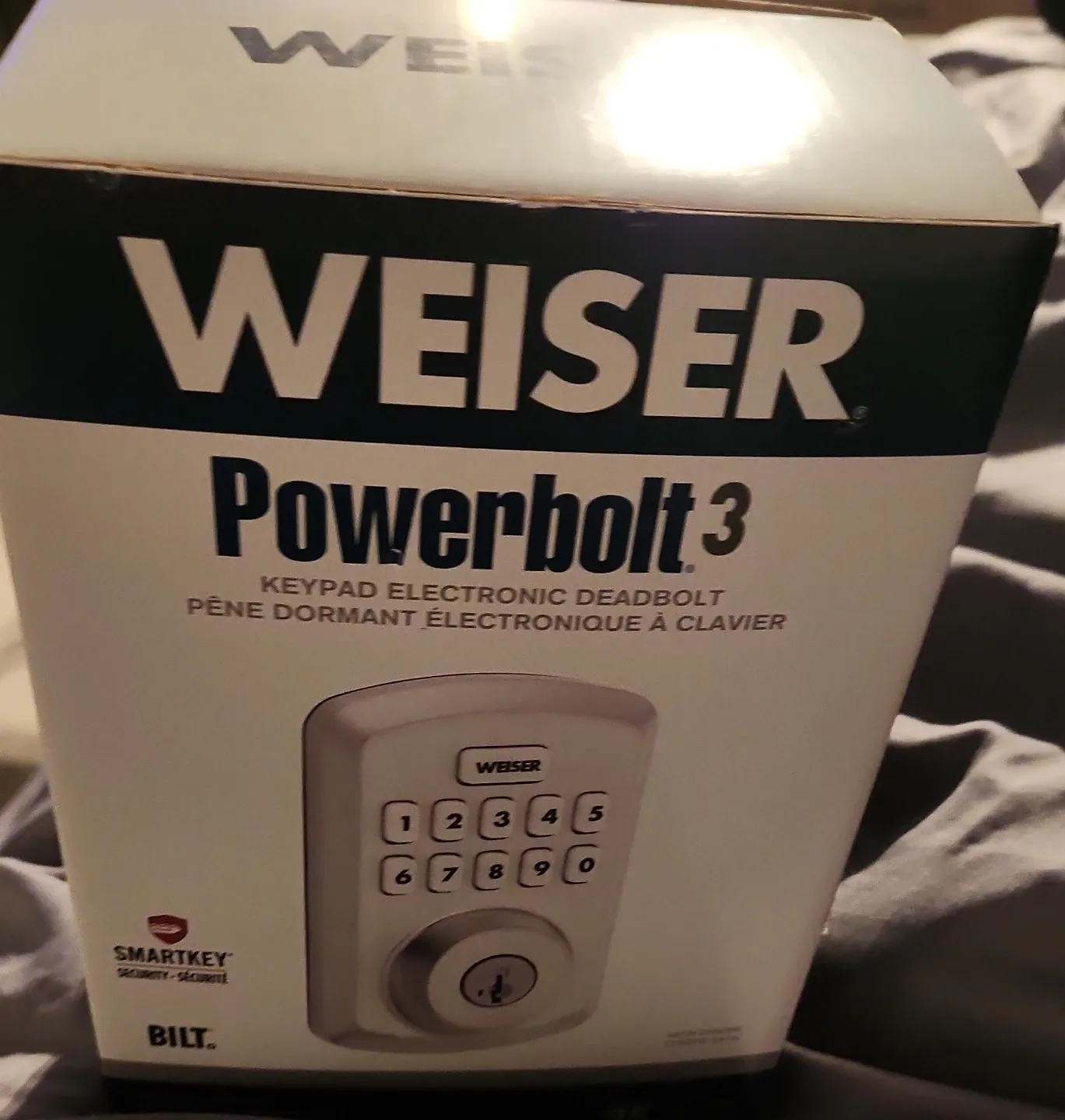 This is a Weiser Powerbolt 3 keypad electronic deadbolt. It features SmartKey security and a BILT design. The deadbolt has a digital keypad for entry and a traditional keyhole.