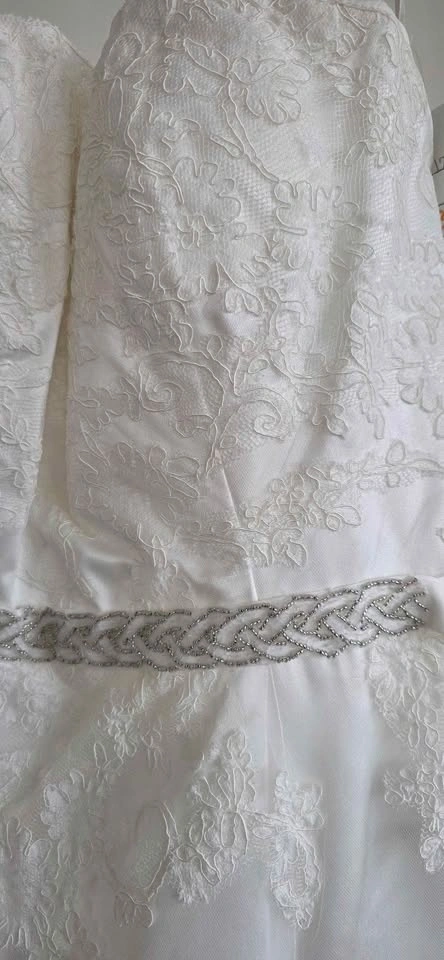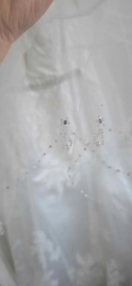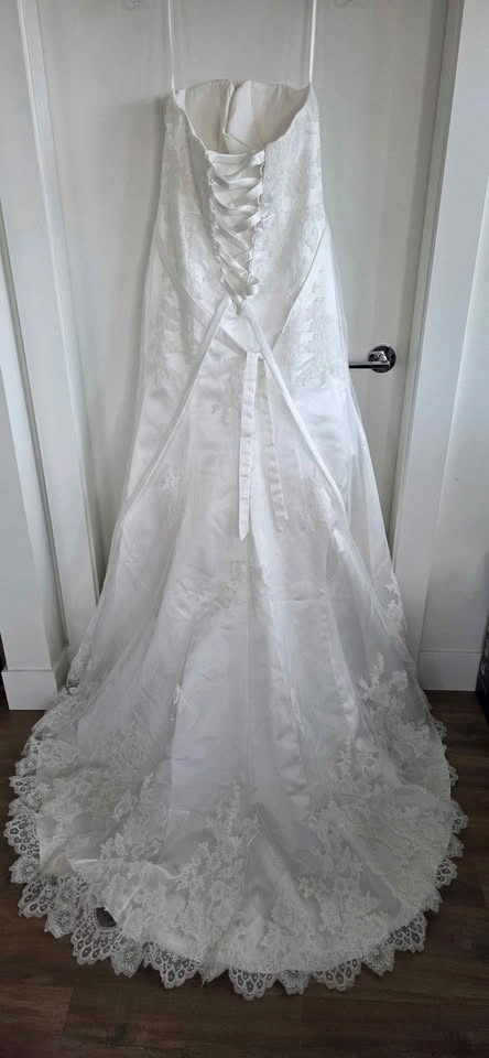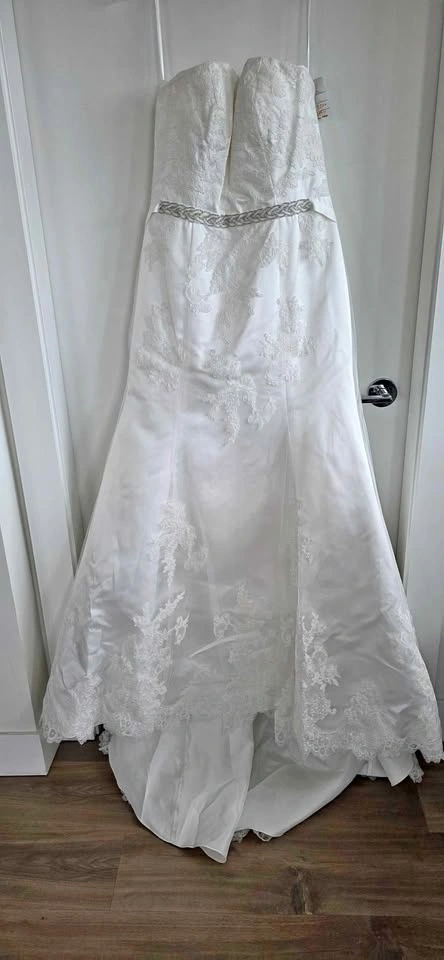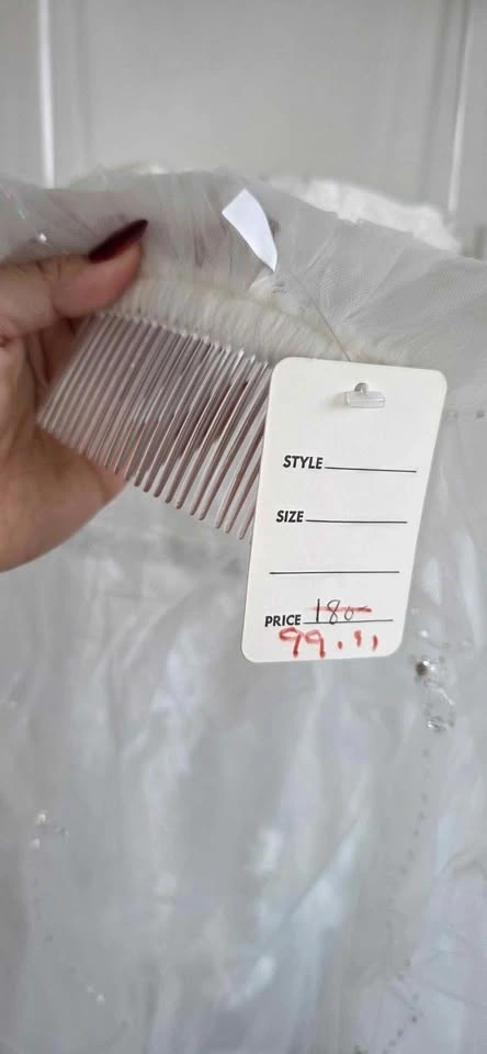 I bought this dress and veil but kept it in my closet as I already had another dress for my wedding. You're essentially getting a store closing sale price and saving on tax. The original price for the dress was $1400 and the veil was $180. It comes with a garment bag. The size is L and it has never been altered.