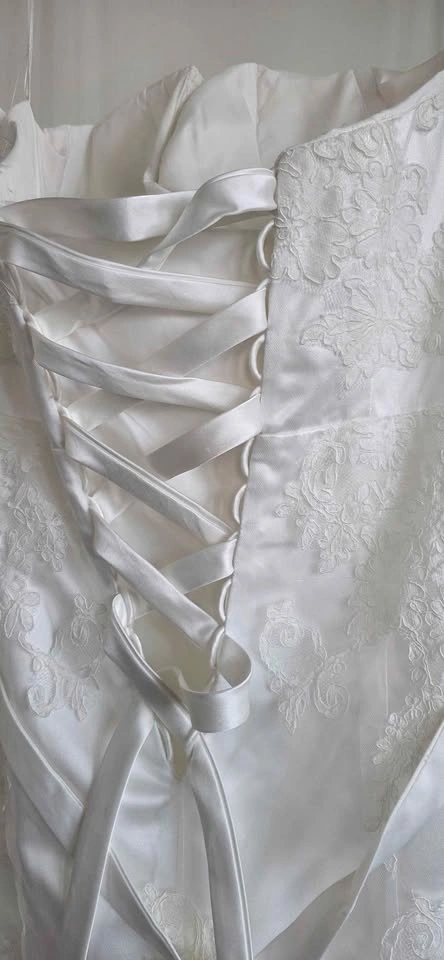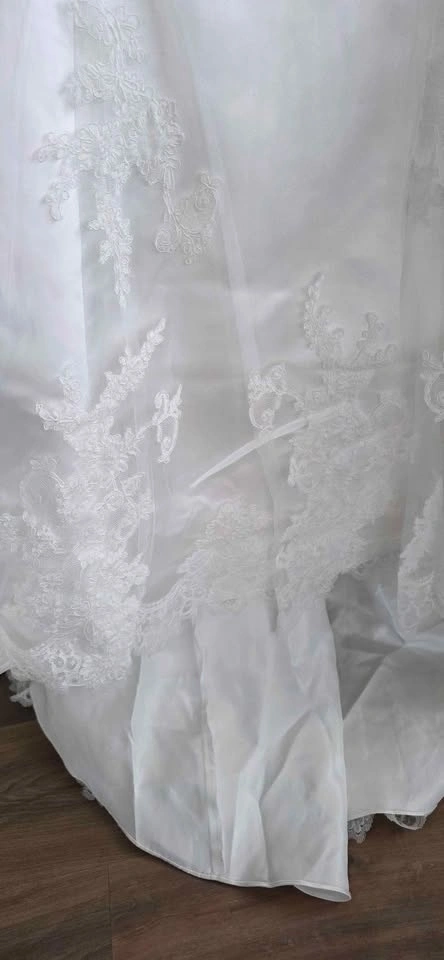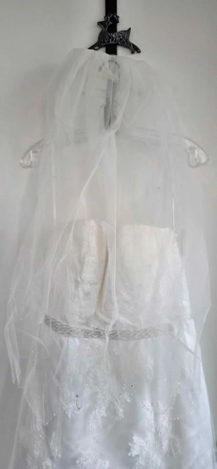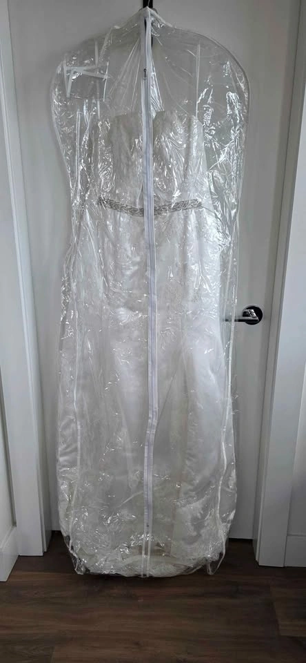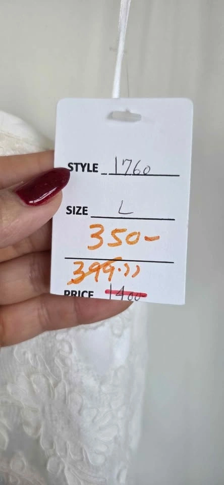 I bought this dress and veil but kept it in my closet as I already had another dress for my wedding. You're essentially getting a store closing sale price and saving on tax. The original price for the dress was $1400 and the veil was $180. It comes with a garment bag. The size is L and it has never been altered.