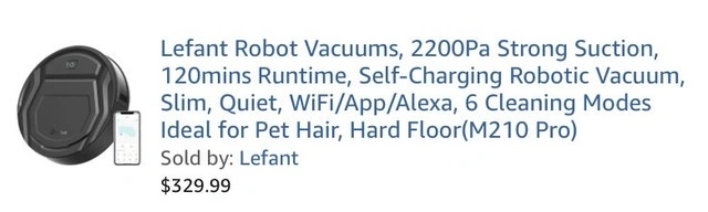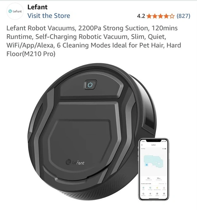 Selling a Lefant M210 Pro robot vacuum, great for pet homes with 2200Pa suction. It's compact (11" wide, 2.9" tall) and has a hair-free design with a brushless suction port. Features include self-charging, anti-fall, anti-collision, and a washable filter. It comes with 5 cleaning modes (Zigzag, Random, Spot, Edge, manual) and can be scheduled via the Lefant App. It also works with Alexa and Google Home (2.4GHz Wi-Fi only). Offers up to 120 minutes of runtime. Located near Markham & Kingston.